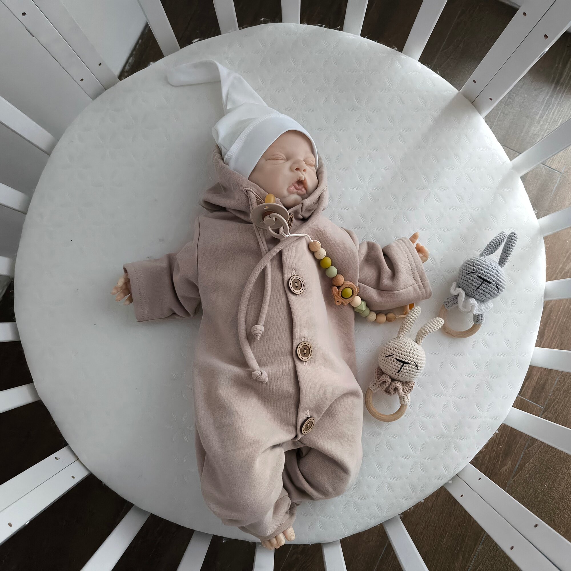 Комбинезон MAMINY ZAPISKY Комбинезон из футера с капюшоном, с утягивающими завязками, 0-3 мес, MAMINY ZAPISKY, открытая стопа, размер 62, бежевый интересное: