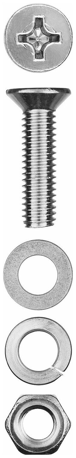 Винт (DIN965) в комплекте с гайкой (DIN934), шайбой (DIN125), шайбой пруж. (DIN127), M6 x 30 мм, 10 шт, ЗУБР интересное: