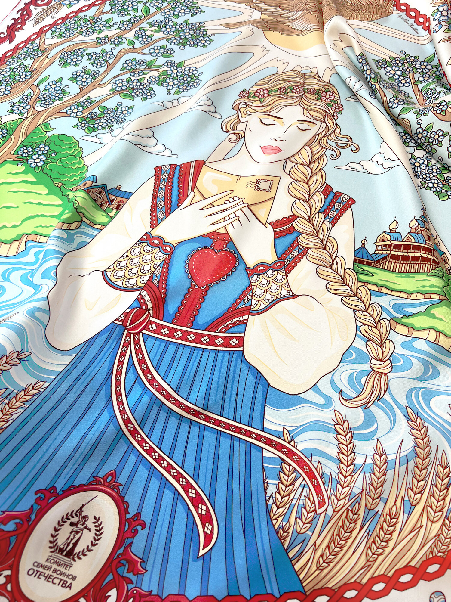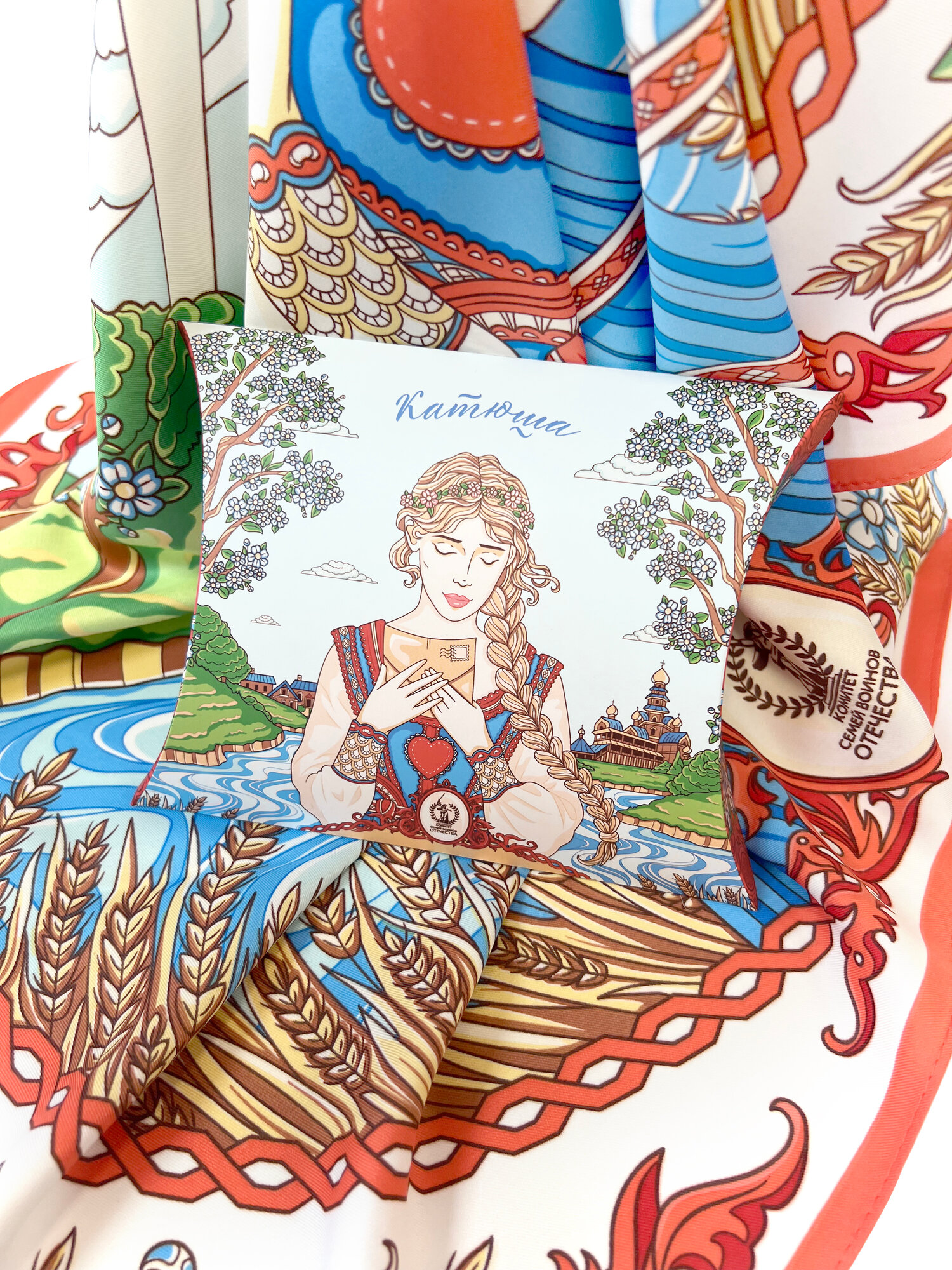 Платок Русские в моде by Nina Ruchkina Победа для девочек и женщин,90х90 см, белый, красный, голубой интересное: