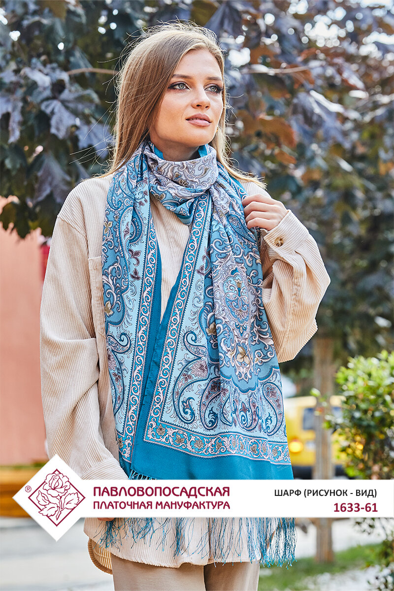 Шарф Павловопосадская платочная мануфактура для женщин,190х50 см, one size, синий/голубой/бежевый интересное:
