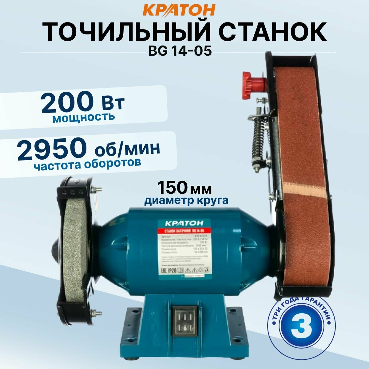Станок заточной Кратон BG 14-05( оригинал) , электроточило (200 Вт, Размеры шлифовального круга 150х20х32 мм, Ленточно-шлифовальный узел)