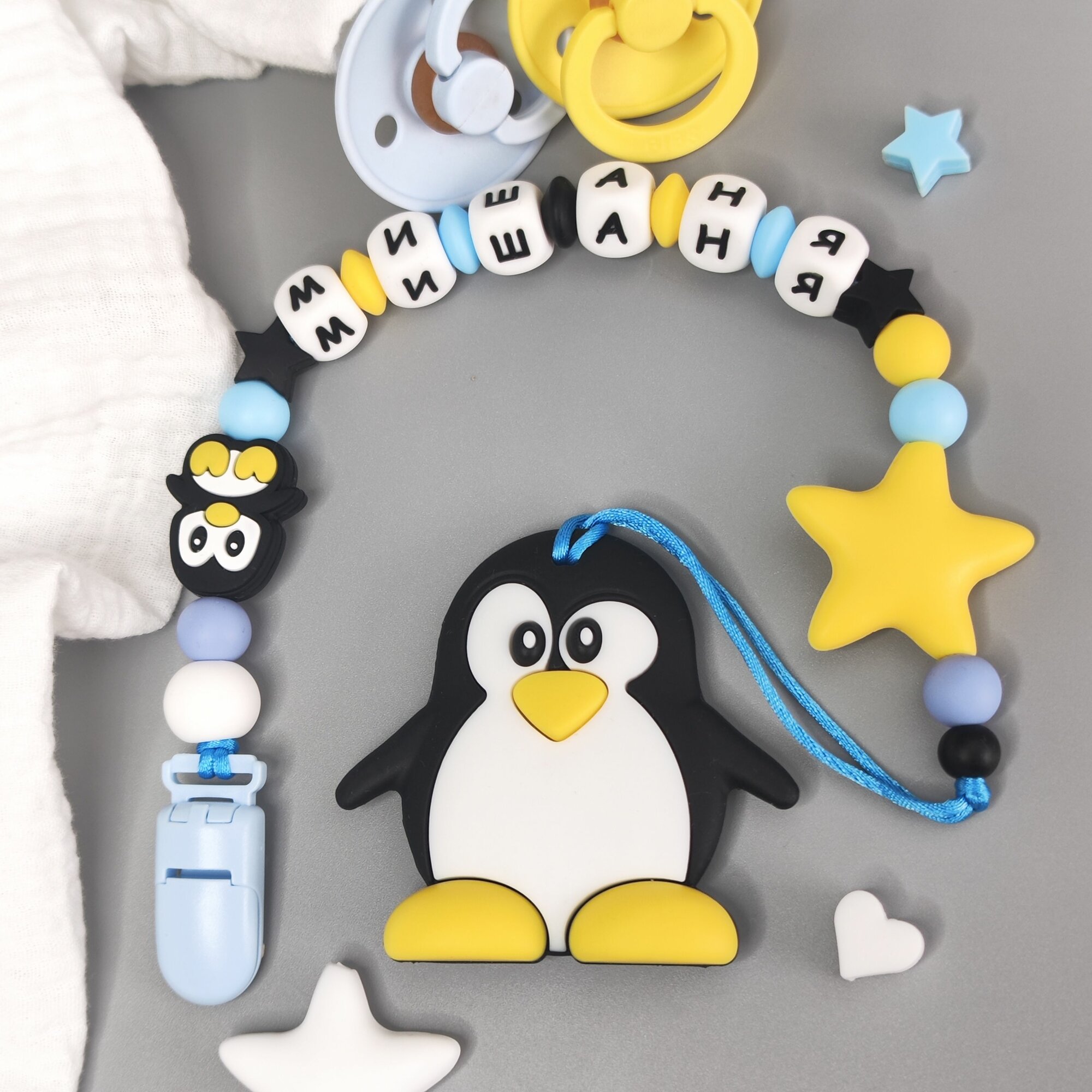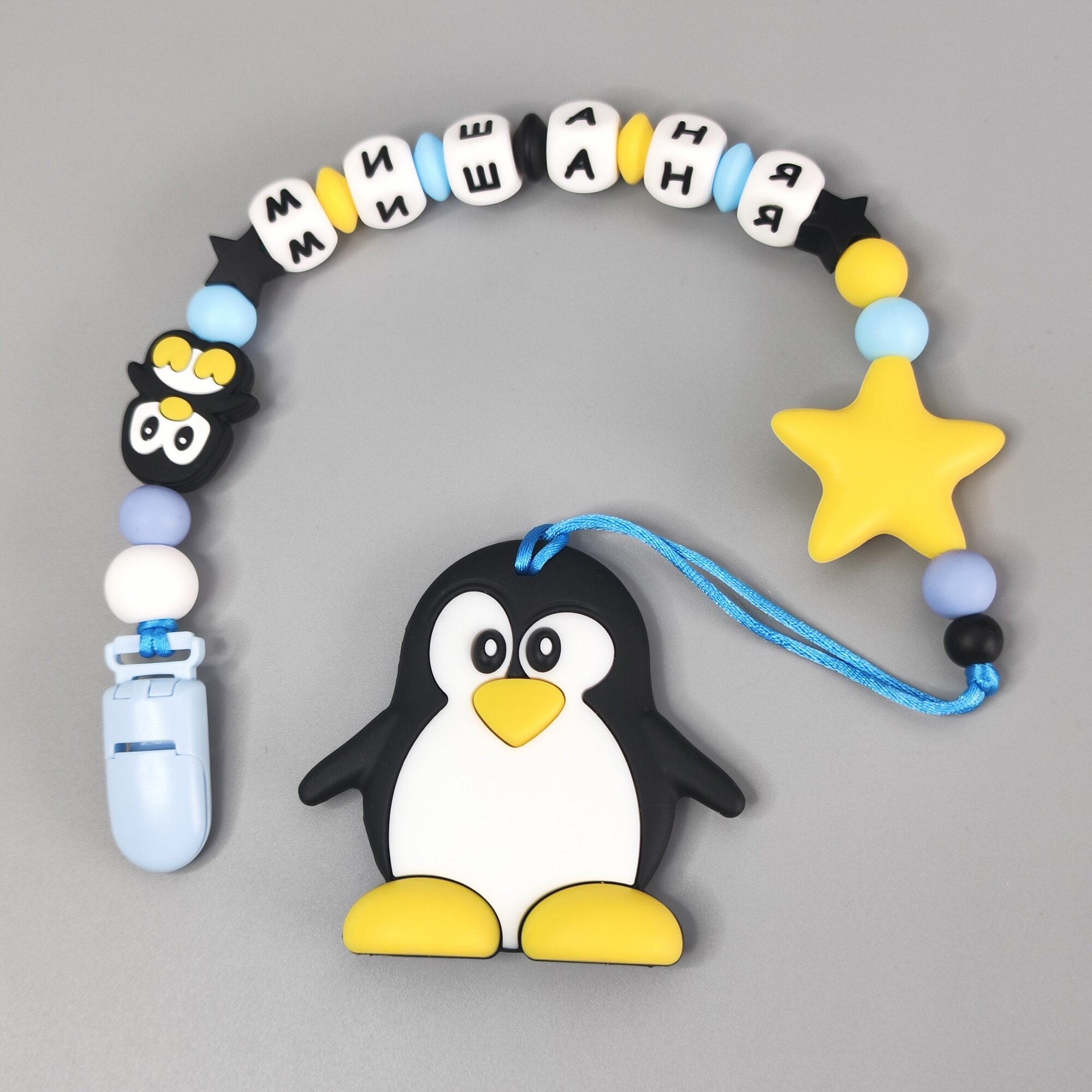 Именной силиконовый держатель для пустышки с грызунком - Михаил, Миша, для новорожденных, прорезыватель