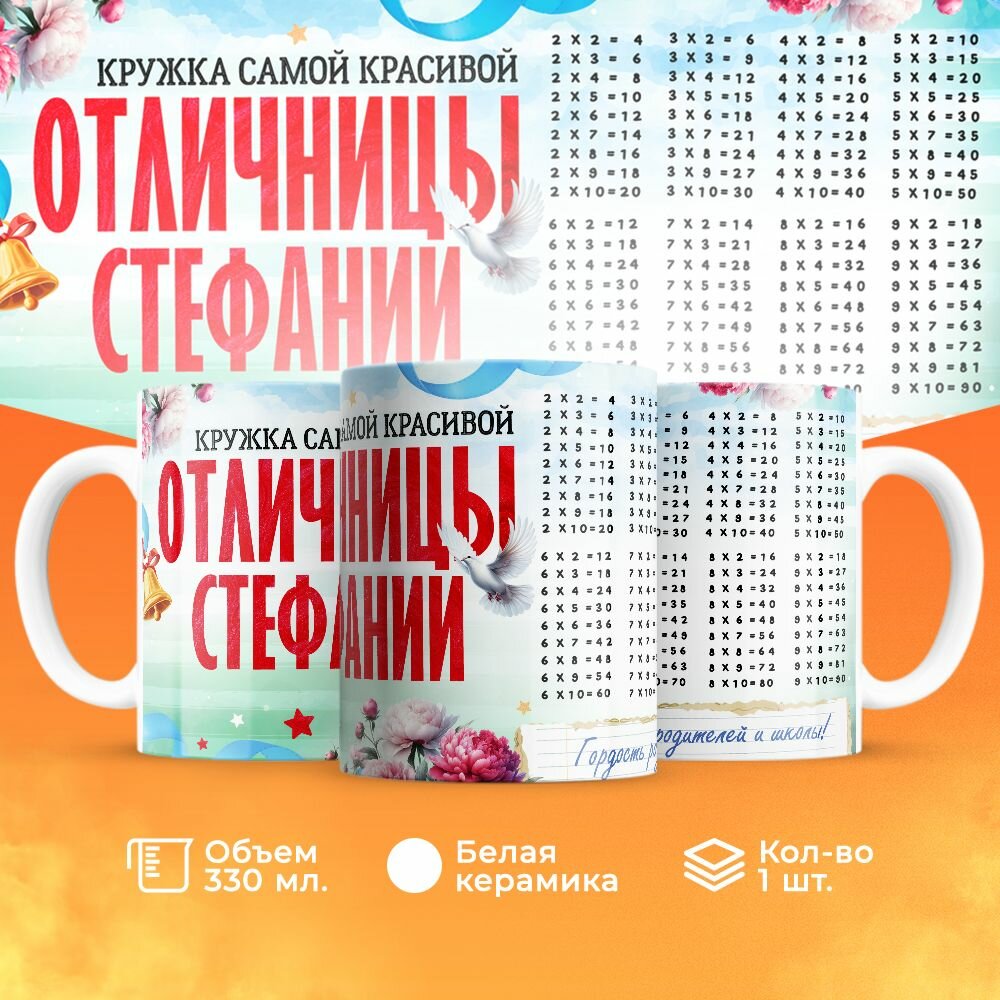 СохранитьКружка, "Самой красивой отличницы Стефании", на день рождения дочки, в подарок для девочки, внучки с таблицей умножения 330 мл интересное: