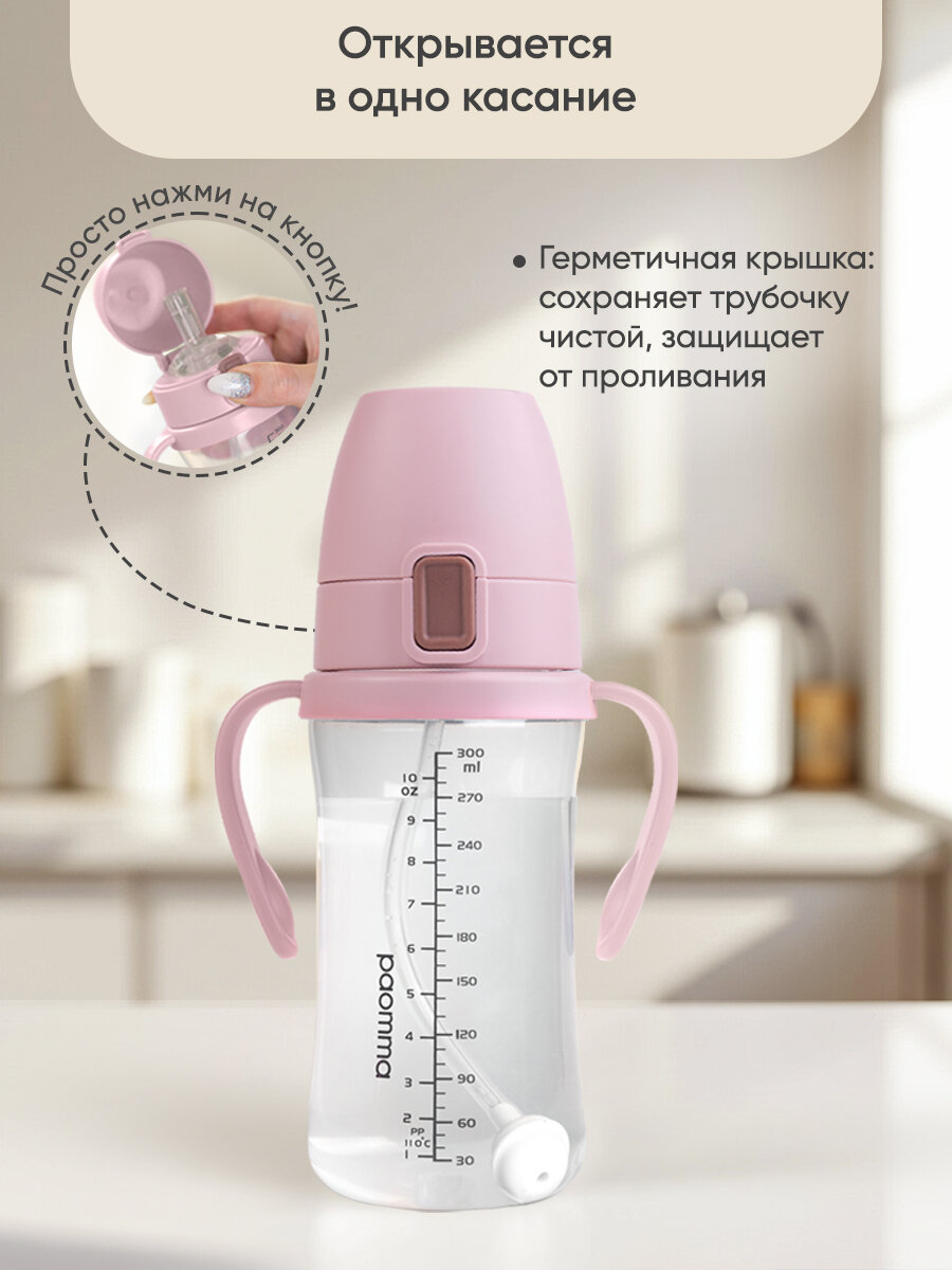 Поильник непроливайка Paomma, детский, с трубочкой и ручками, мерные деления, 300 мл
