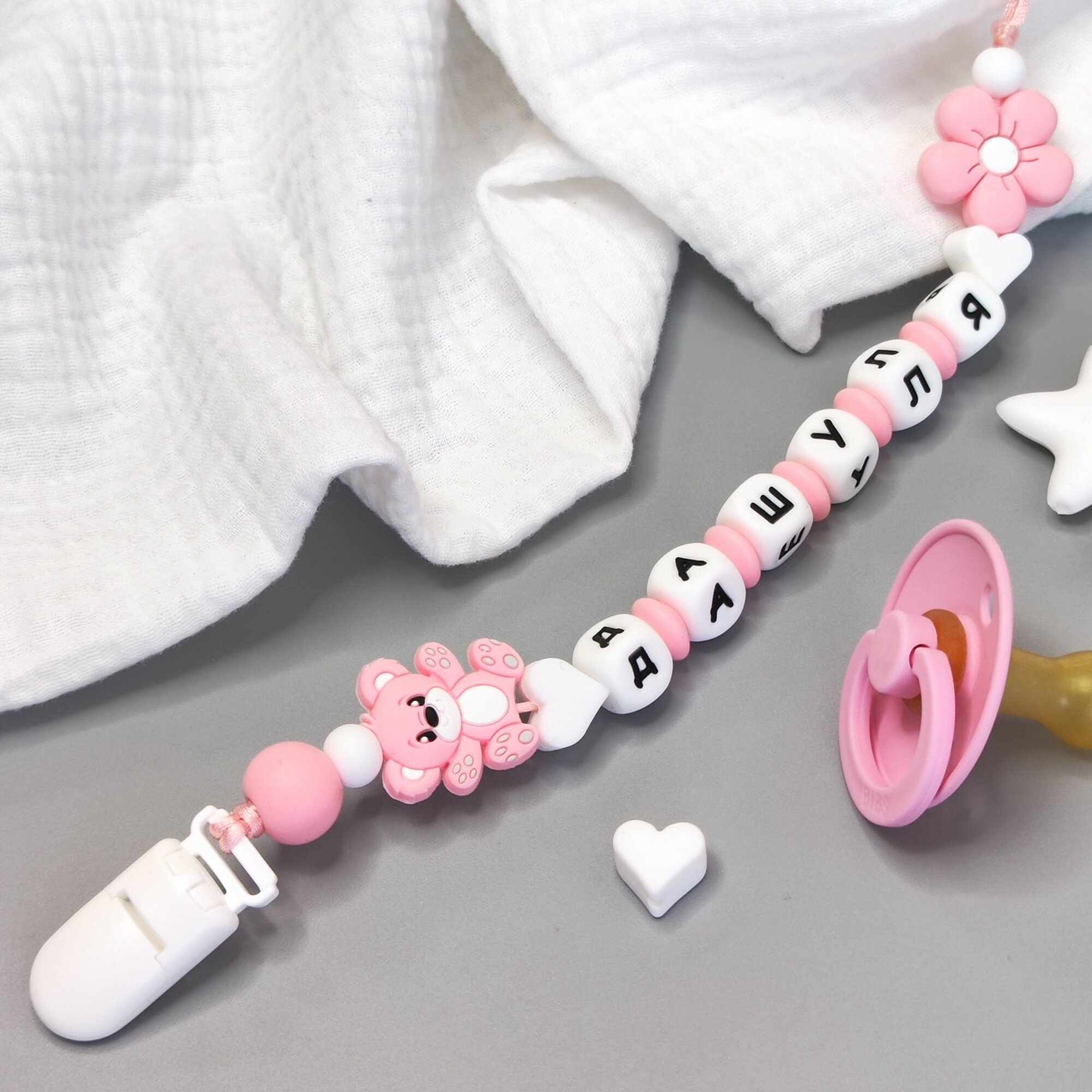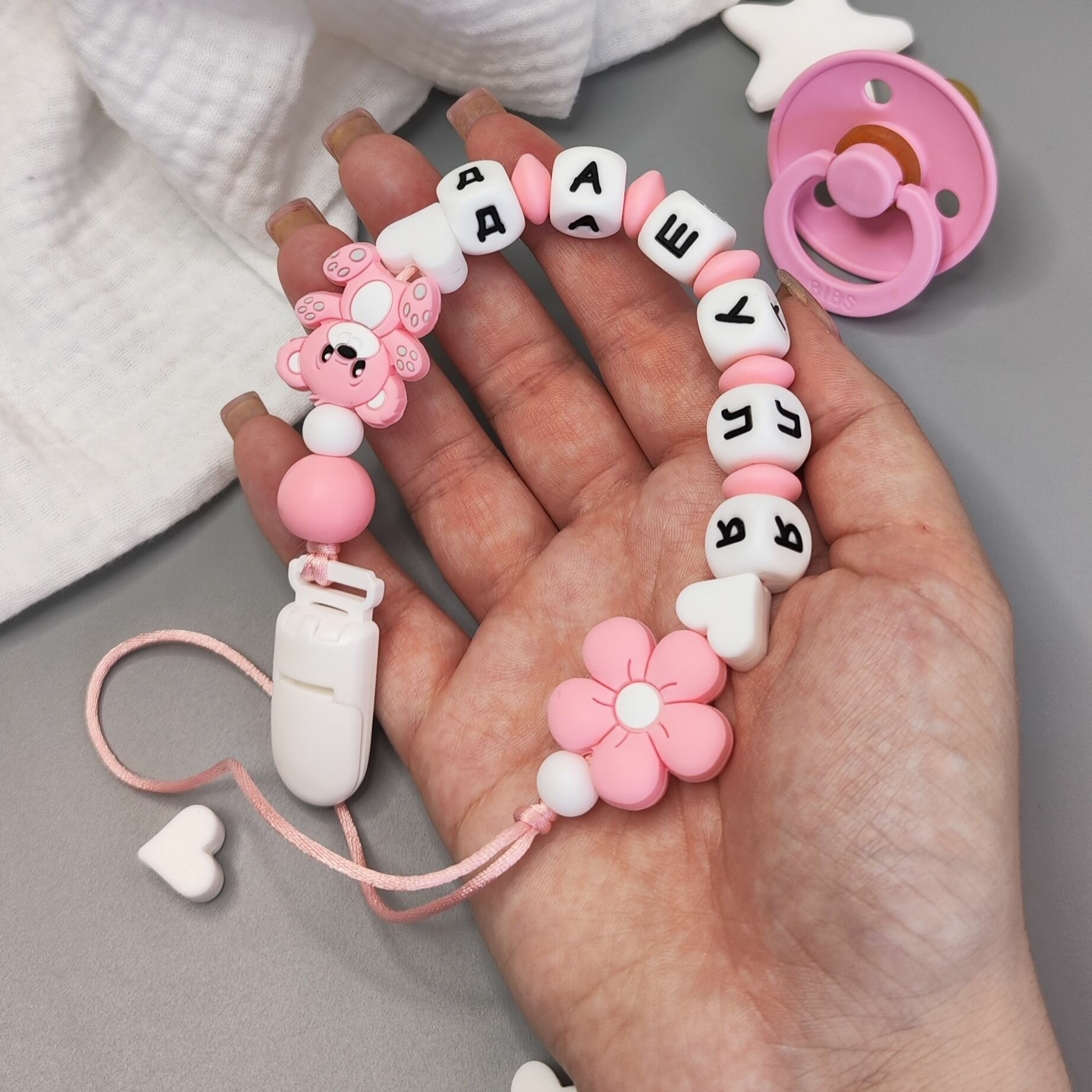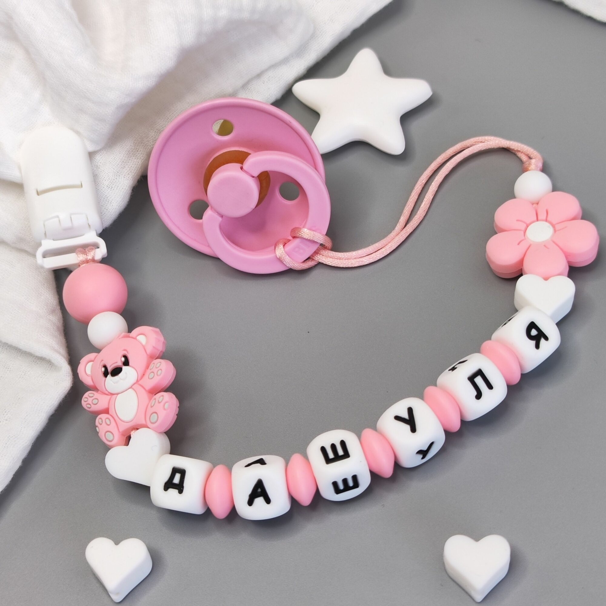 Именной силиконовый держатель для пустышки - Даша, для новорожденных, прорезыватель интересное: