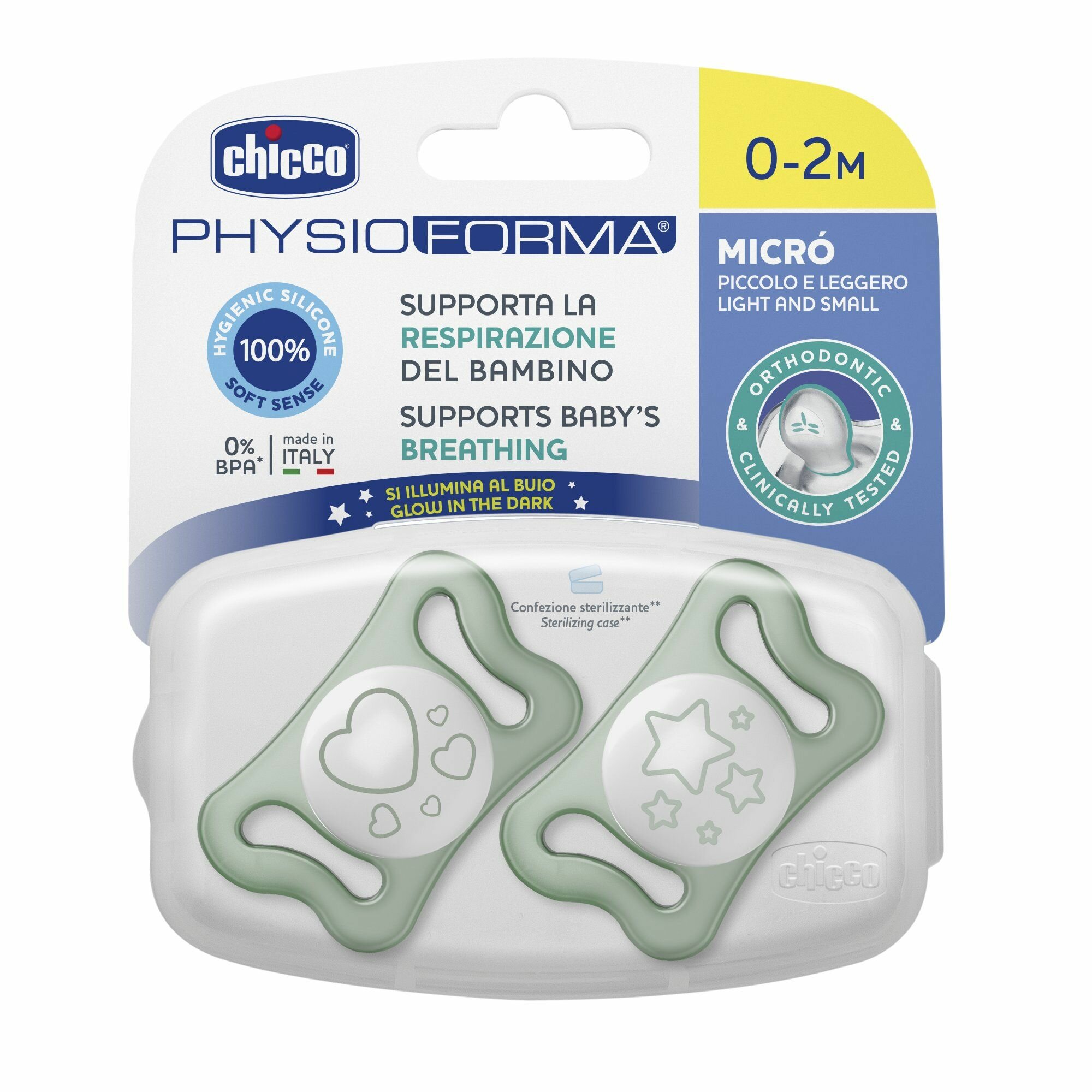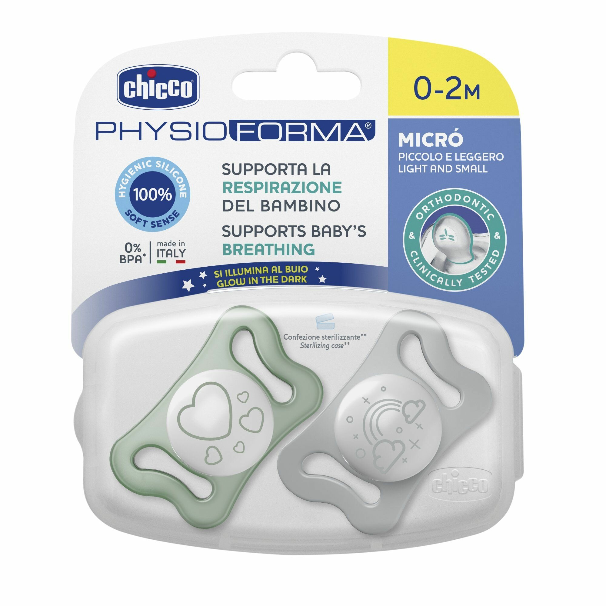 Купить Соска пустышка для новорожденных 0-2 мес Chicco Утешение Physioforma Micro 2 шт, Люминесцентный
