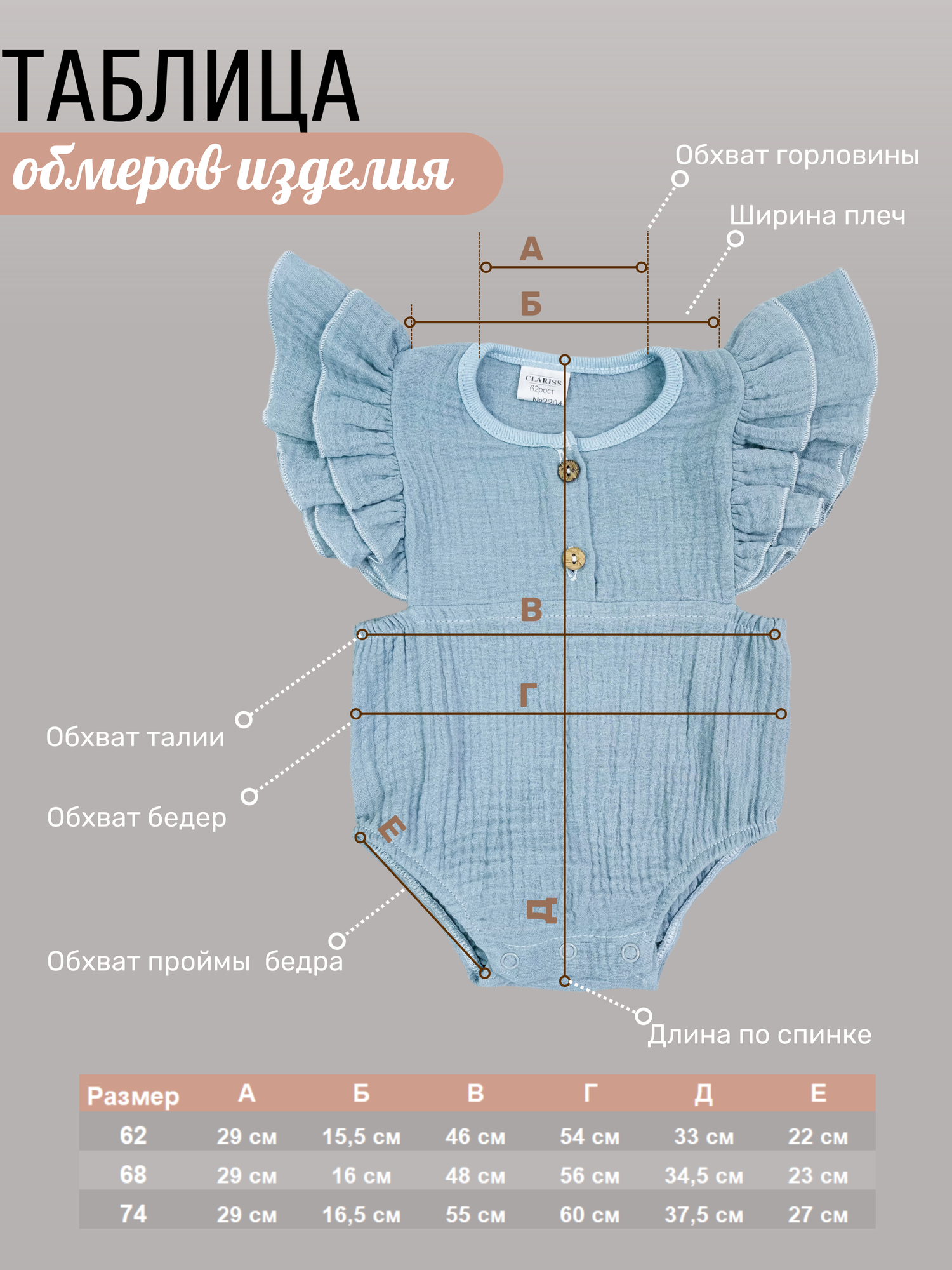 СохранитьБоди Clariss Весна-лето 2024, размер 20 (62-68) 2-3 мес., серо-голубой интересное: