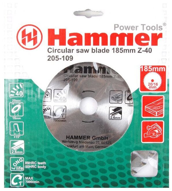 Диск пильный по дереву 185х20/16х40, CSB WD, 205-109, Hammer Flex интересное: