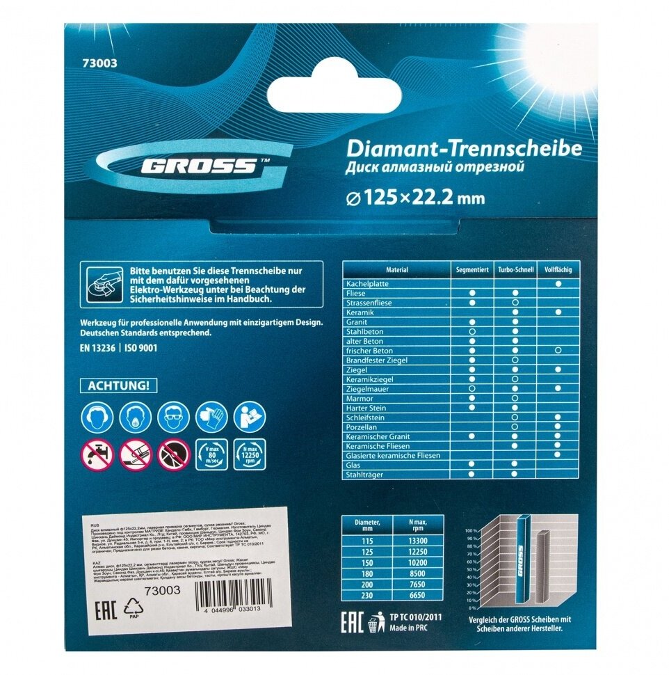 Диск алмазный, 125 х 22.2 мм, лазерная приварка сегментов, сухая резка Gross 73003