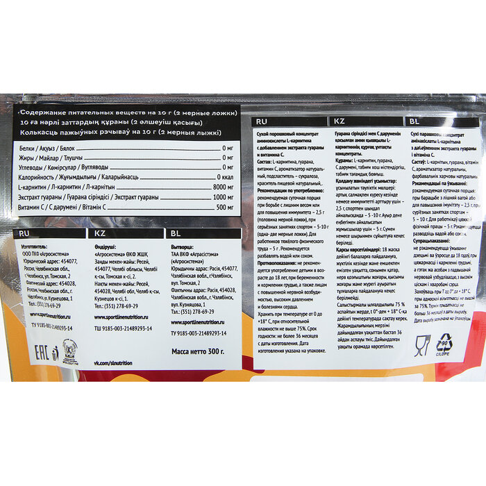Дозировка 2 мерных ложки, будь там достаточно Л-карнитина, вы бы не слазили с туалета. Ради эксперимента принял 4 - ничего. Вывод: Очень дорогая аскорбинка с гуараной. |