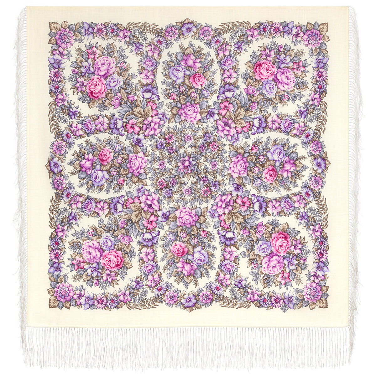 Купить Платок Павловопосадская платочная мануфактура для женщин,89х89 см, бежевый/фиолетовый