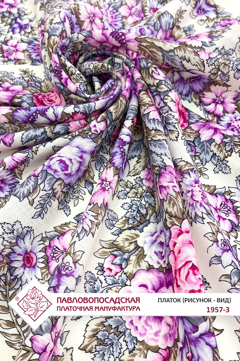 Платок Павловопосадская платочная мануфактура для женщин,89х89 см, бежевый/фиолетовый интересное: