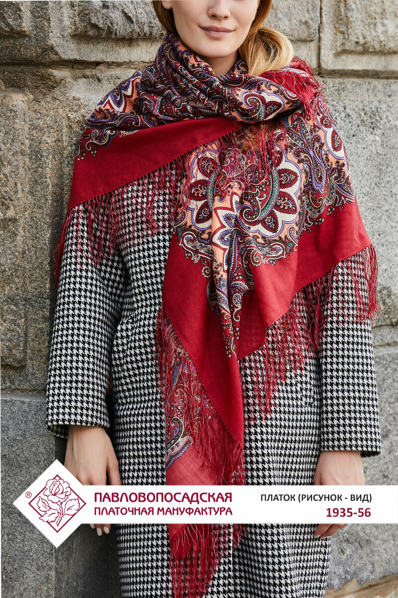Платок Павловопосадская платочная мануфактура для женщин,146х146 см, бежевый, коралловый, красный интересное: