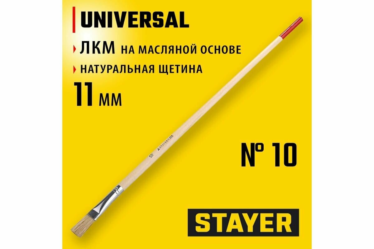 STAYER UNIVERSAL, 11 мм, светлая натуральная щетина, деревянная ручка, все виды ЛКМ, плоская тонкая кисть (0124-10)