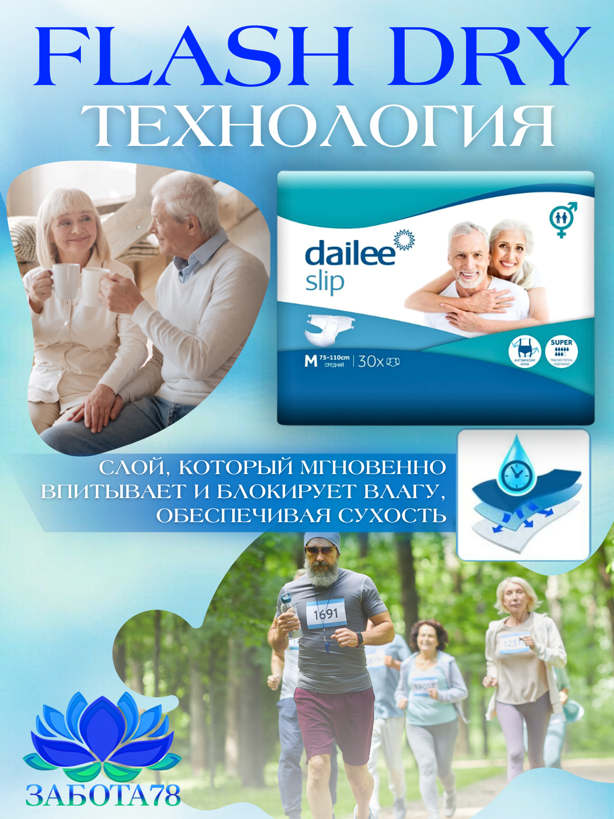Подгузники для взрослых Dailee Super (Дейли Супер) - M (Medium), объем талии 75-110 см, 8 капель, дневные и ночные, 30 штук