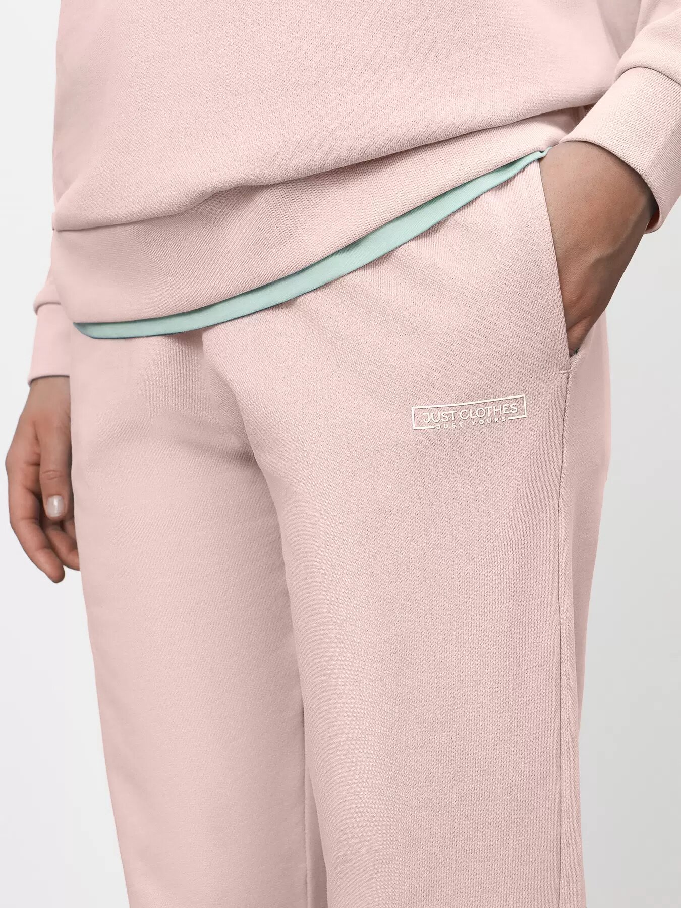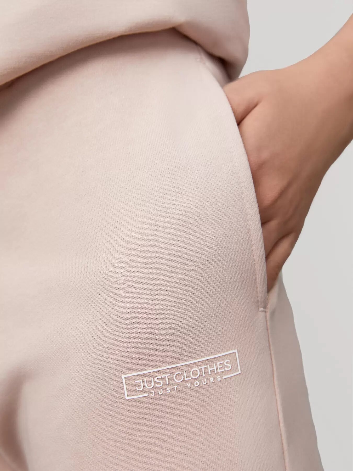 Брюки спортивные JUST CLOTHES Пудровый. Декор термологотип. Карманы спереди 2 б/заст, сзади нет. Пояс резинка+утяг шнурок. Д 103см, размер M, пудровый