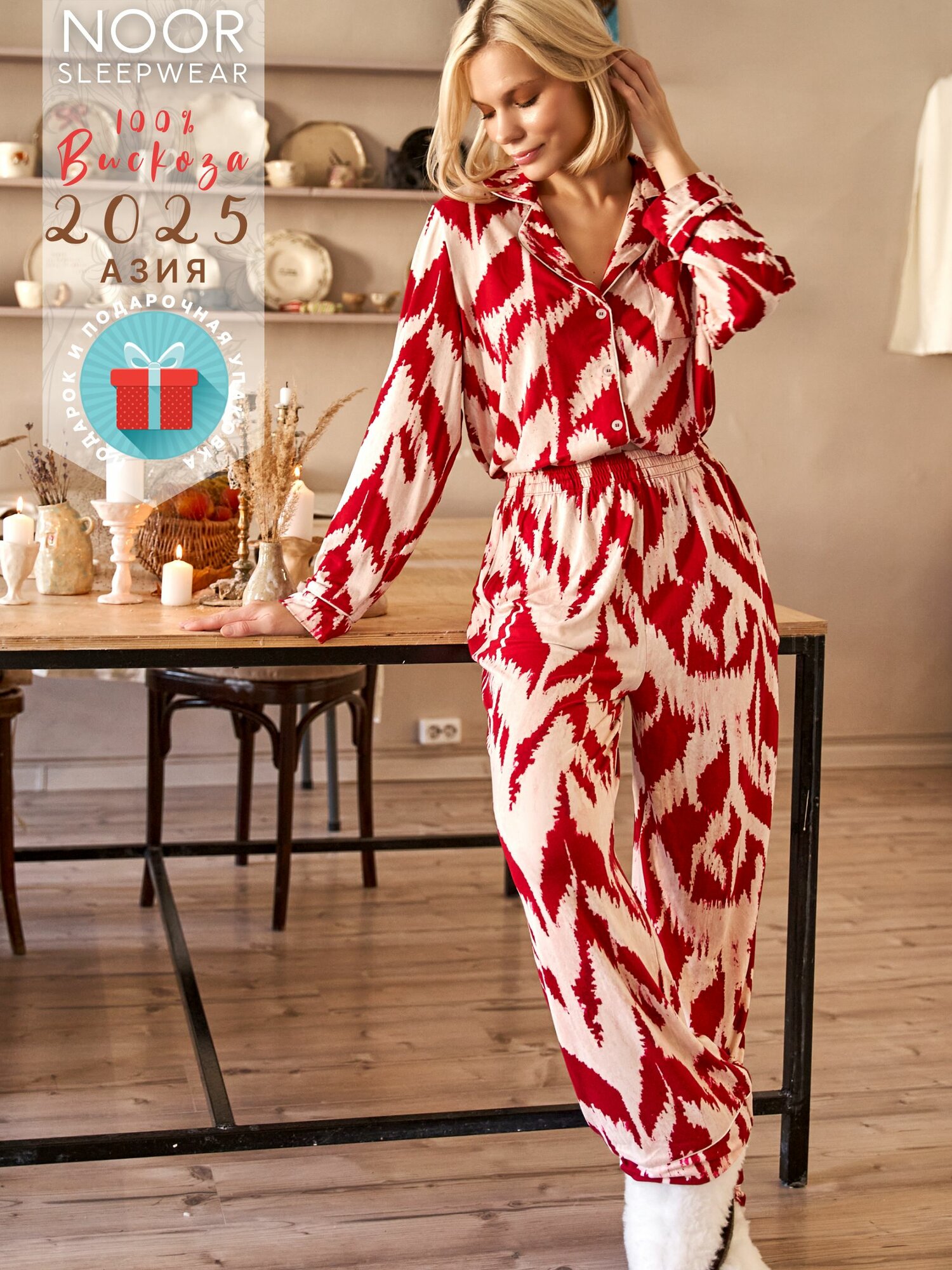 Пижама NOOR Зима 2025, размер L (170cм), красный, белый интересное: