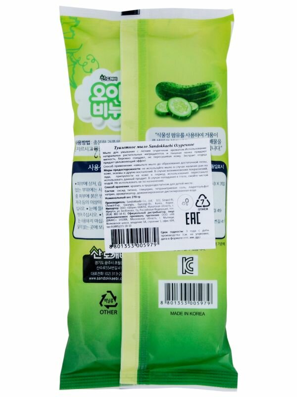 Sandokkaebi мыло / Косметическое туалетное мыло для рук и лица на основе плодов масличной пальмы / мыло твердое с ароматом огурца , 80 г х 3 шт. / Корея