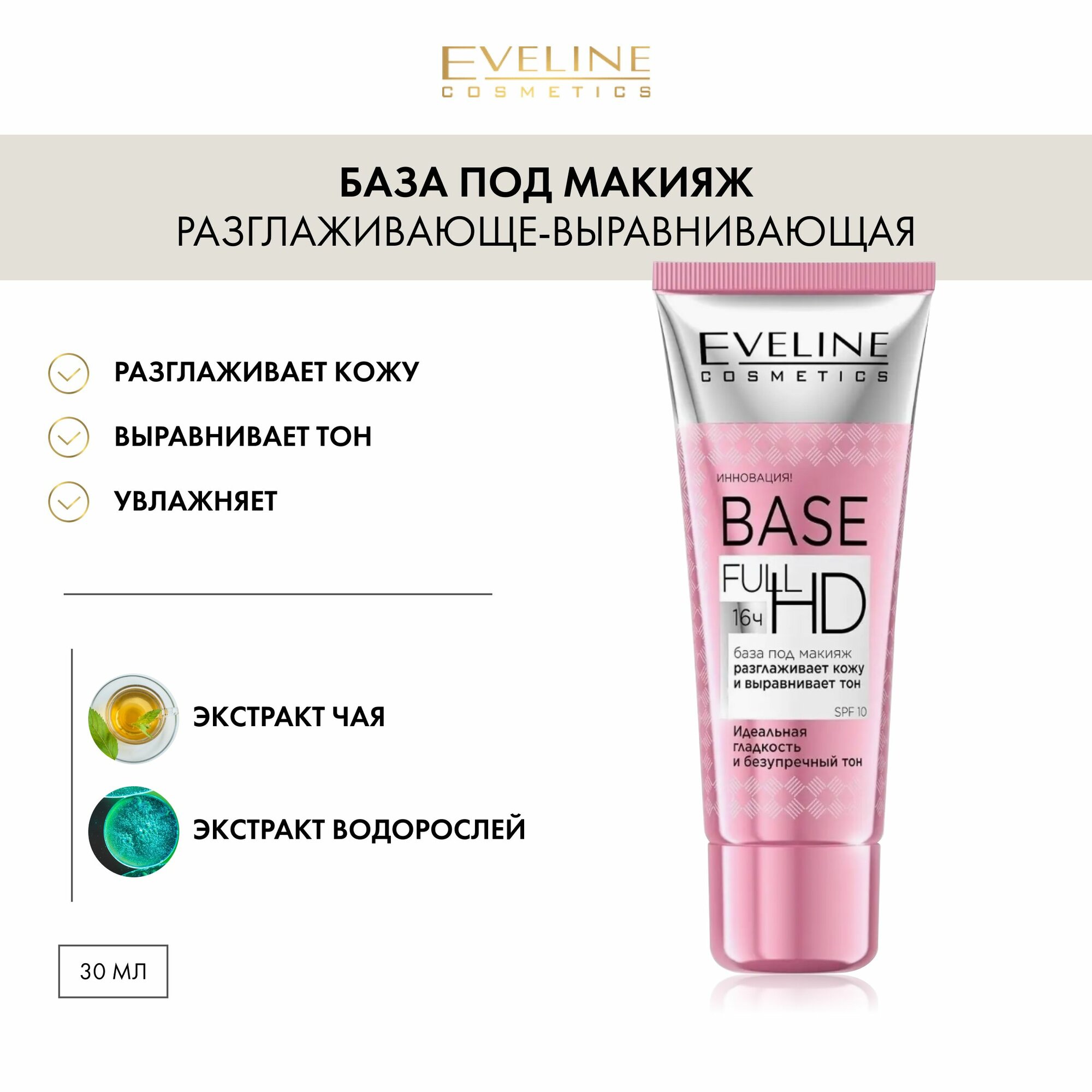 База под макияж EVELINE «BASE FULL HD», разглаживающе-выравнивающая, 30мл