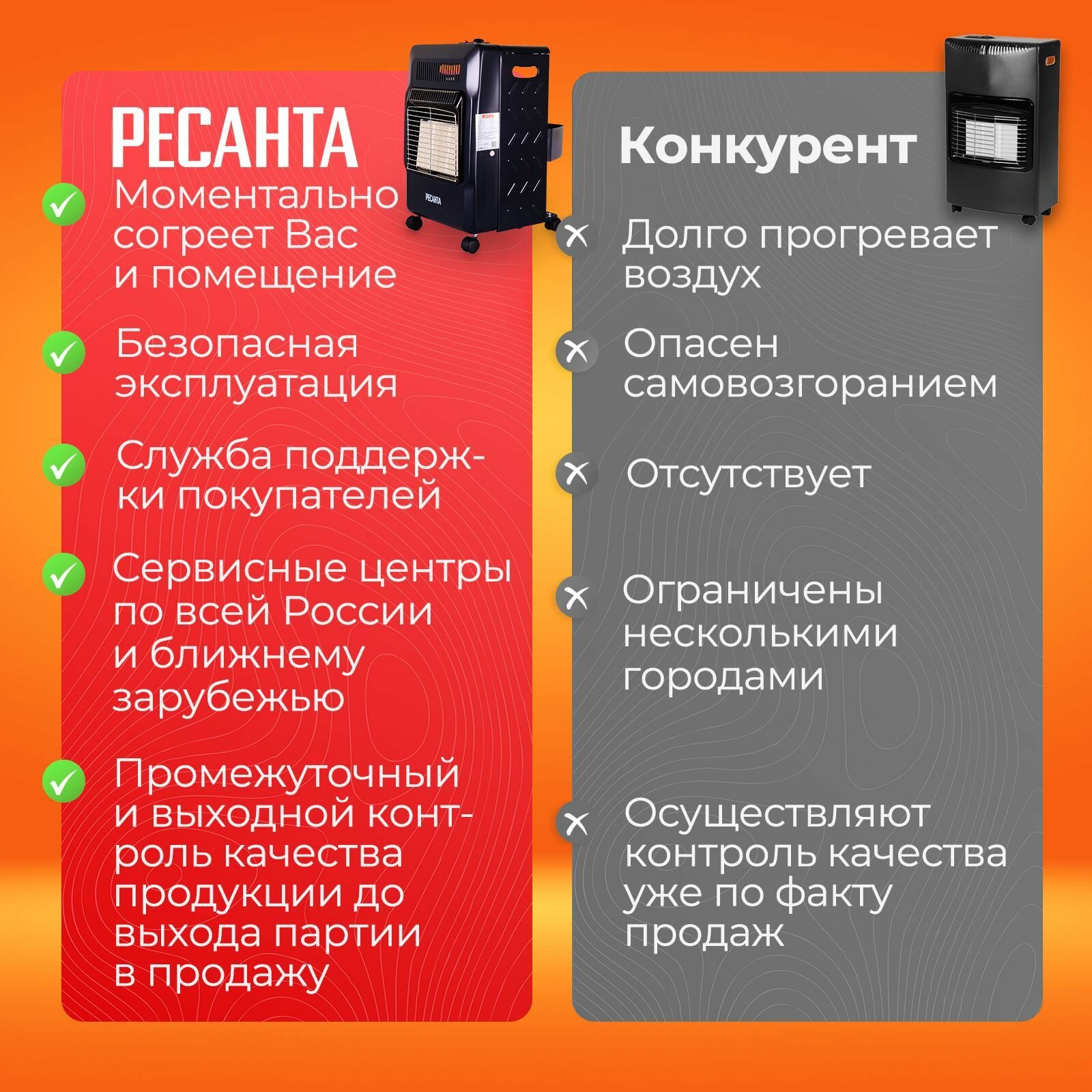 | Плюсы: | Прост в использовании, быстро нагревает помещение, запах газа отсутствует |
