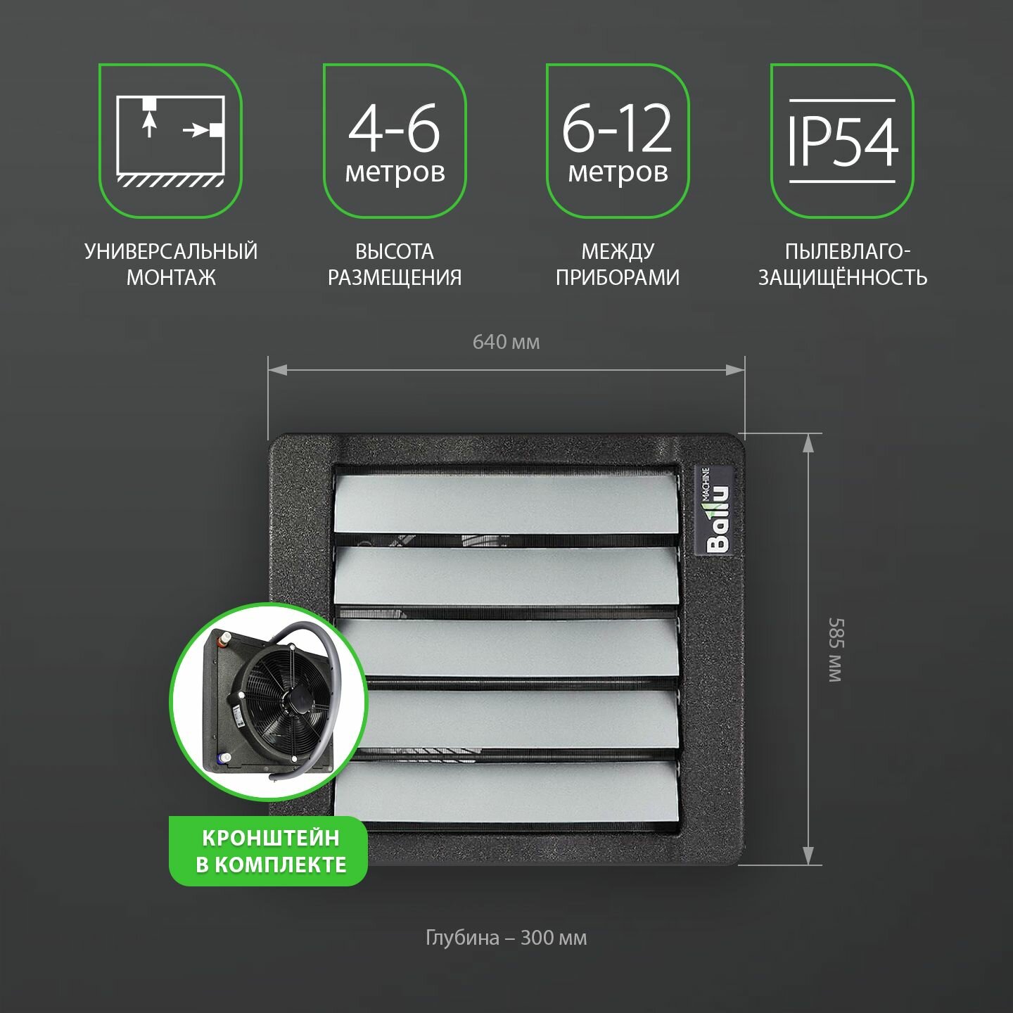 | Дополнительная информация | в комплекте универсальный кронштейн, который позволяет установить прибор на стены, колонны или потолок; дальность струи воздуха 12 м, номинальная тепловая мощность 19,7 кВт, расход воздуха, м3/ч 2400/2000/1500, максимальная температура теплоносителя 150 ⁰С |