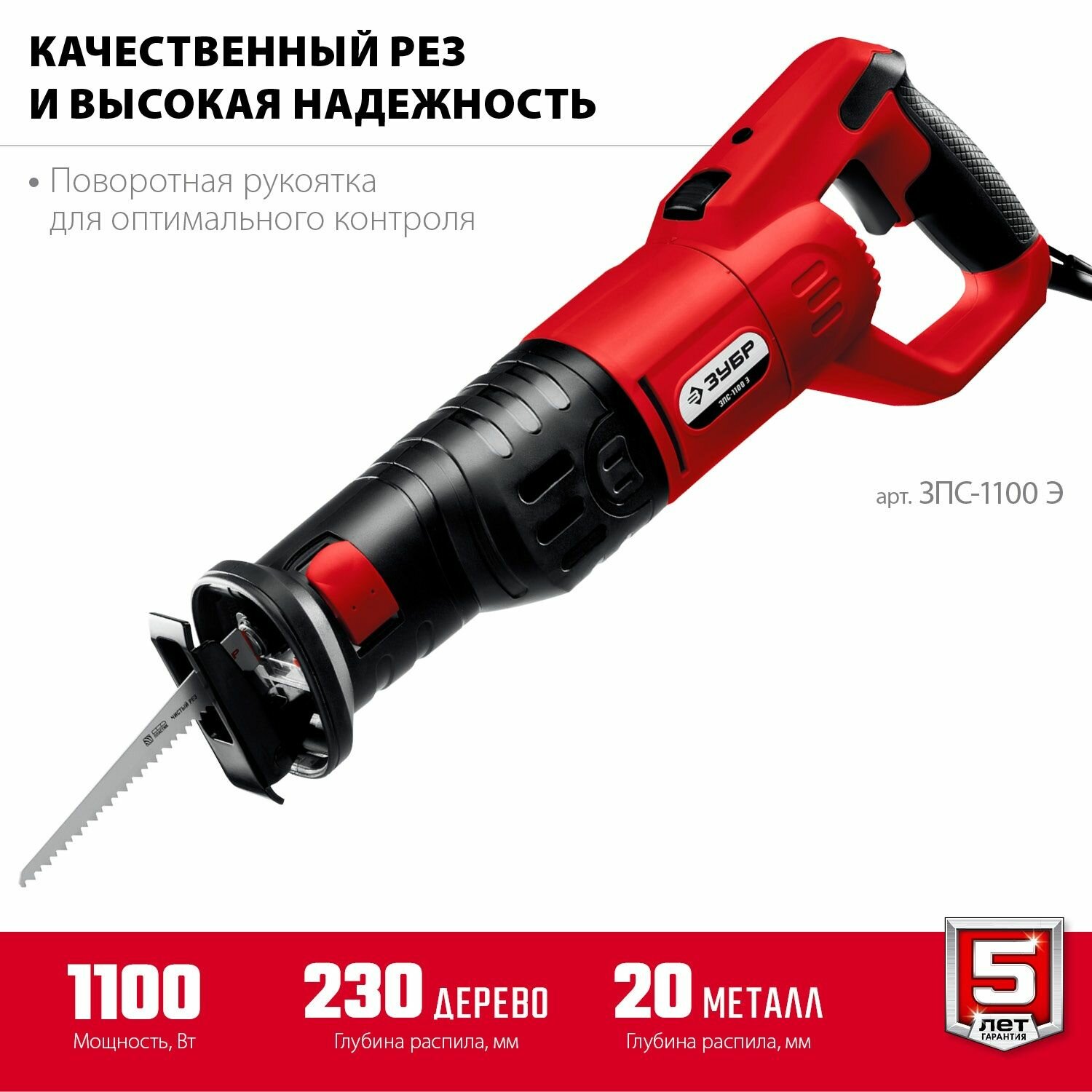 Пила сабельная (электроножовка), ЗУБР ЗПС-1100 Э, 1100 Вт, 800-2700 ход/мин, рез 230 мм (дерево), 20 мм (сталь), ход штока 29 мм(ЗПС-1100 Э)