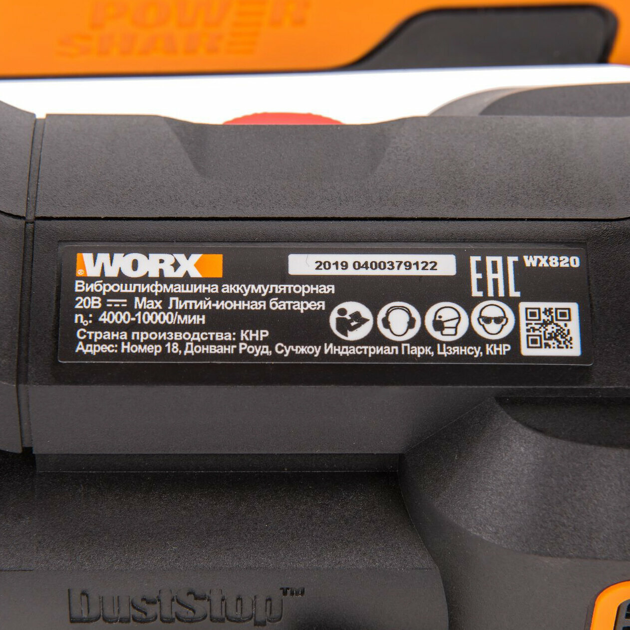 Виброшлифмашина аккумуляторная WORX WX820, 10000/мин, 20В, АКБ 2,0А*ч, ЗУ 2,0A, кейс
