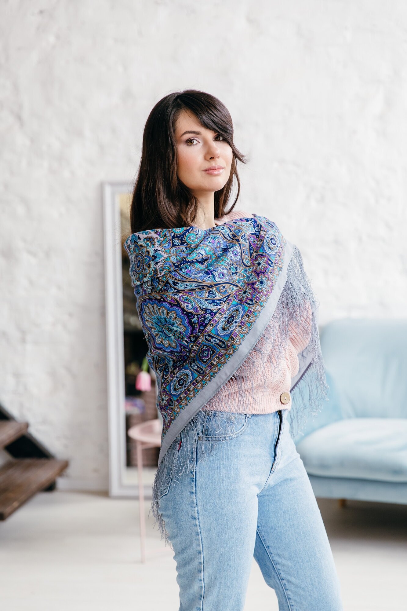 Платок Павловопосадская платочная мануфактура для женщин,110х110 см, голубой интересное:
