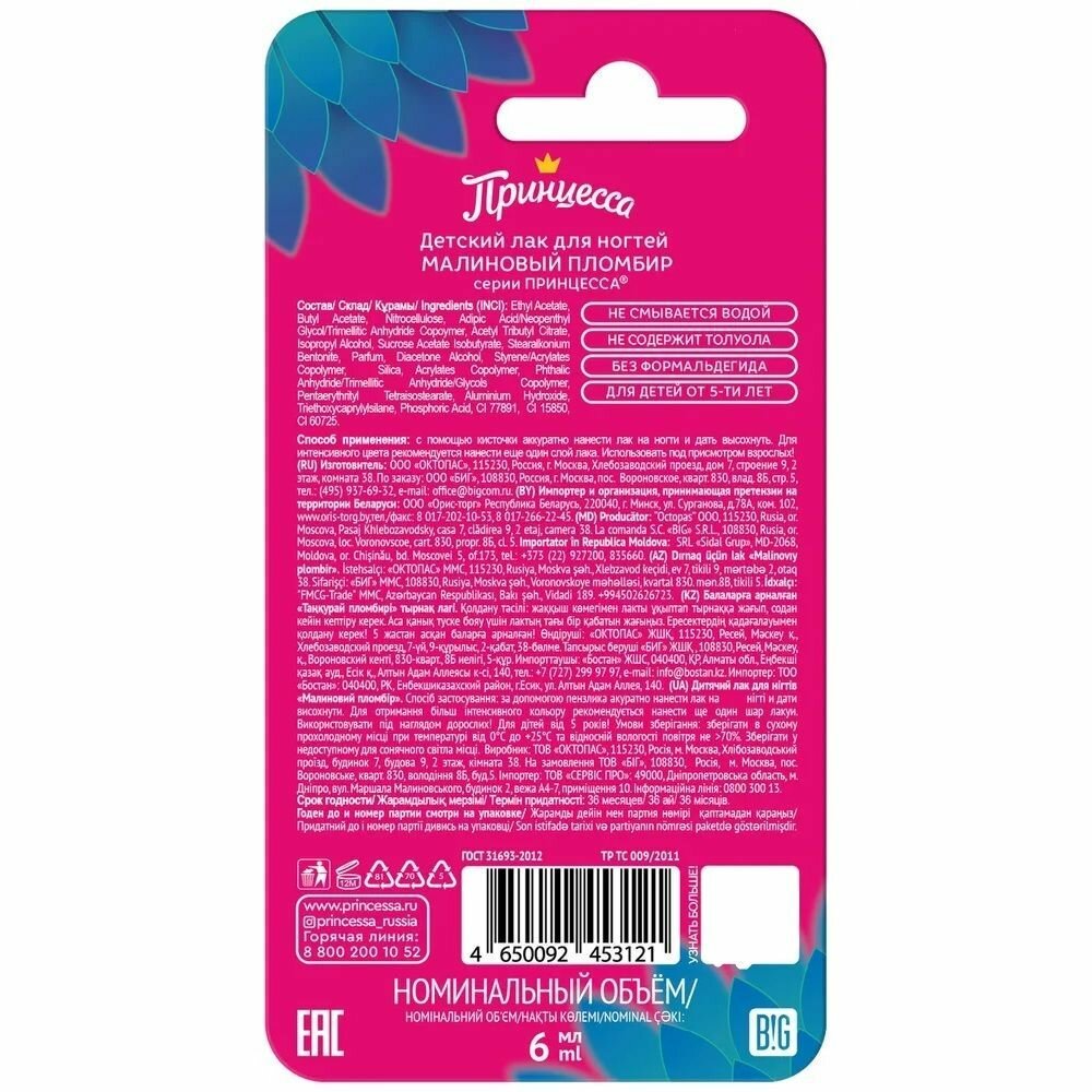 Лак для ногтей "Принцесса Малиновый Пломбир", гипоаллергенный, без ацетона, 6мл интересное:
