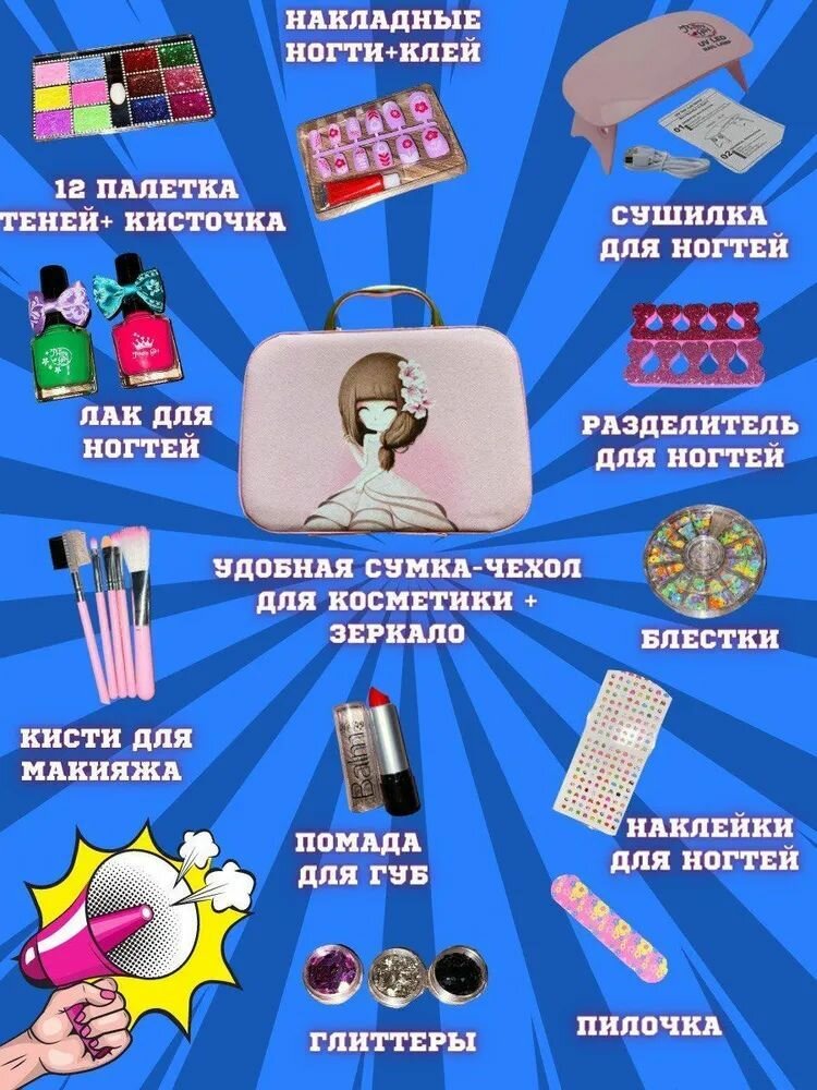 Набор косметики 20 предметов с лампой для сушки ногтей, для девочек в чемоданчике интересное: