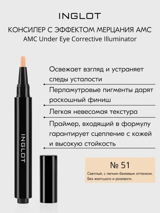 Корректирующий карандаш консилер INGLOT с эффектом мерцания AMC Under Eye Corrective Illuminator №51 интересное: