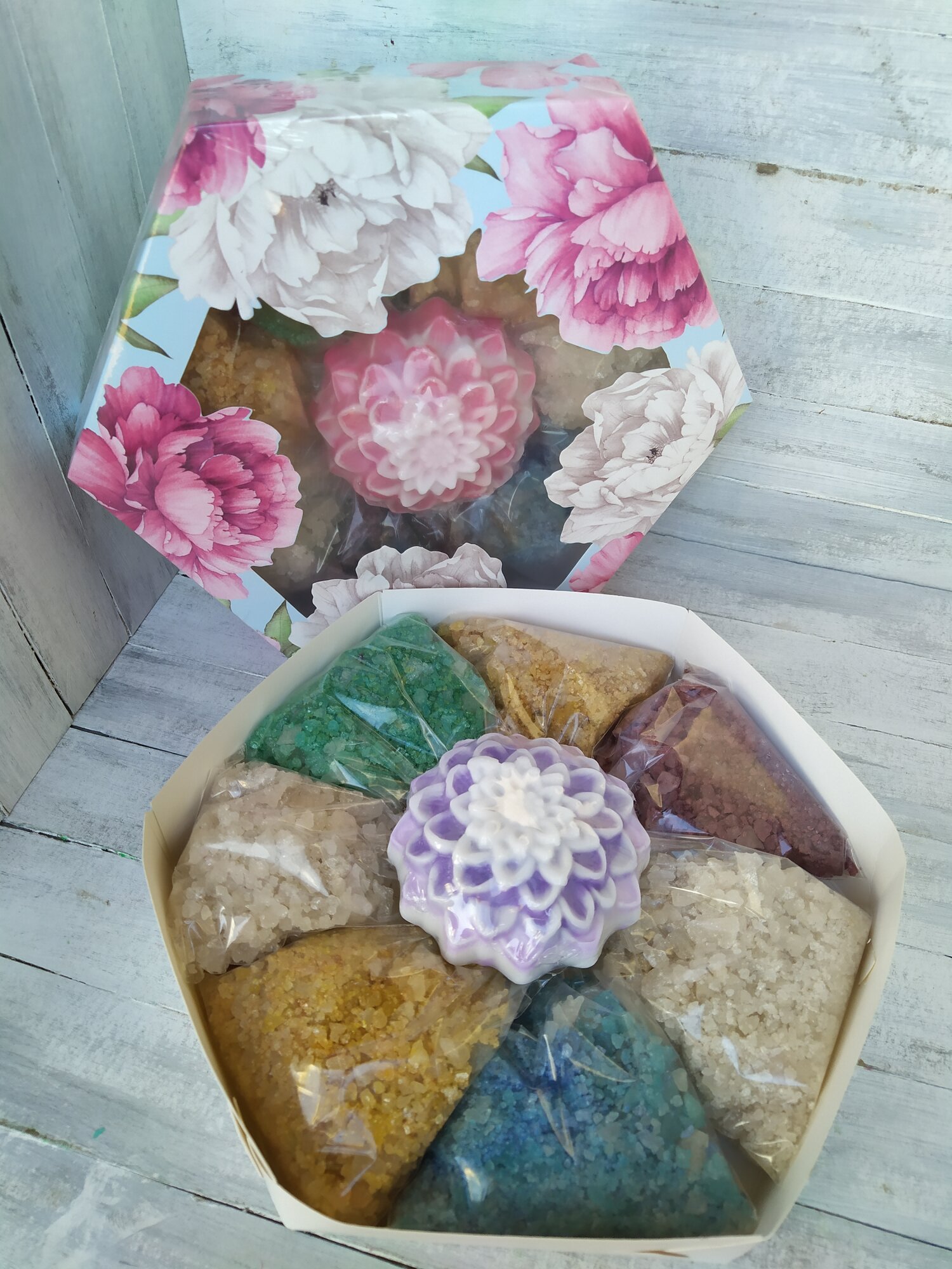 Купить Подарочный набор для женщин" Цветик-семицветик" морская соль для ванны в ассортименте и мыло ручной работы, 990 г