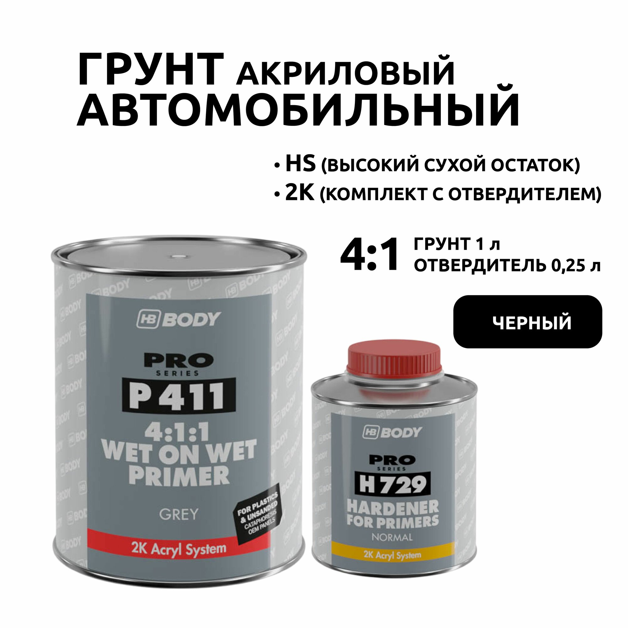 Купить ГРУНТ автомобильный акриловый HS 2K 4:1 ЧЕРНЫЙ 1 л + 0,25 л отвердитель, мокрый по мокрому / HB BODY 411 + H729