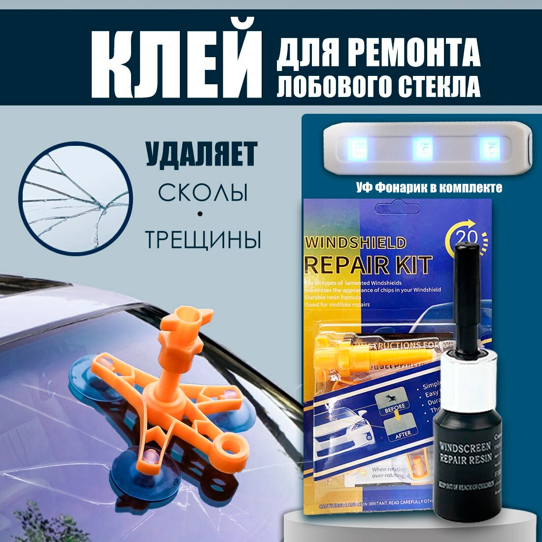 Купить Ремкомплект для лобового стекла, однокомпонентный, клей-герметик, 3 мл, уф фонарик