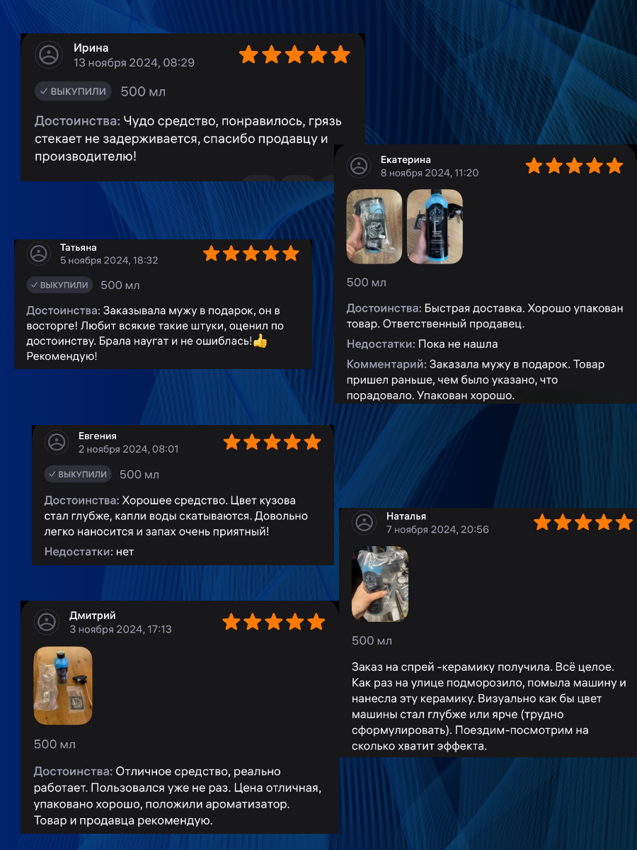 Ниже Вы можете прочитать отзывы на Спрей керамика для автомобиля кузова Platinum Knight CERAMIC SPRAY COATING 500 мл, ознакомится с подробными характеристиками, посмотреть интересные обзоры и фотографии на Спрей керамика для автомобиля кузова Platinum Knight CERAMIC SPRAY COATING 500 мл.
