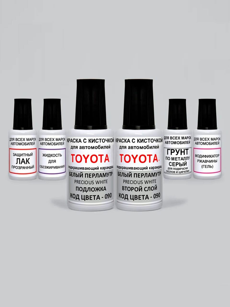 Краска для сколов во флаконе с кисточкой 2PS Toyota: 218 Toyota Черный перламутр, Attitude Black и 089 Toyota Белый перламутр, Platinum White Pearl 3*20 мл. , краска+лак 6 предметов