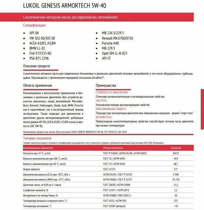 Моторное масло Лукойл Genesis Armortech for European Cars 5W-40 4л интересное: