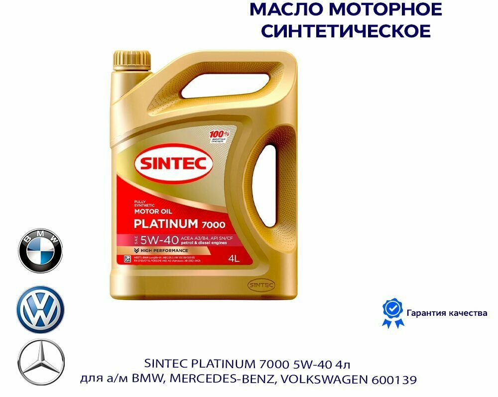 Масло моторное синтетическое SINTEC Platinum 7000 5W40 4 л для а/м BMW, MERCEDES-BENZ, VOLKSWAGEN (600139) интересное: