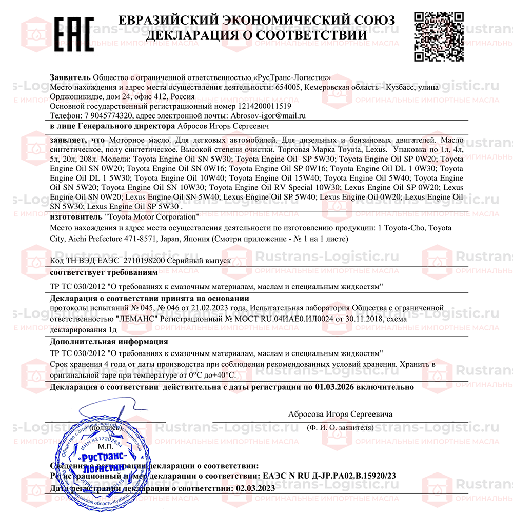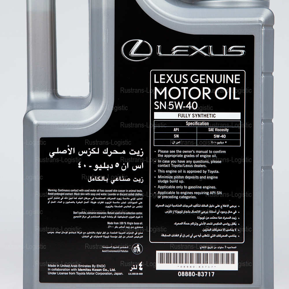 Моторное масло Lexus SN 5W-40 (Дубай), (4л) + бирка, масло моторное 5w40 синтетическое для автомобиля Лексус/Тойота 5w40 08880-83717, РТЛ