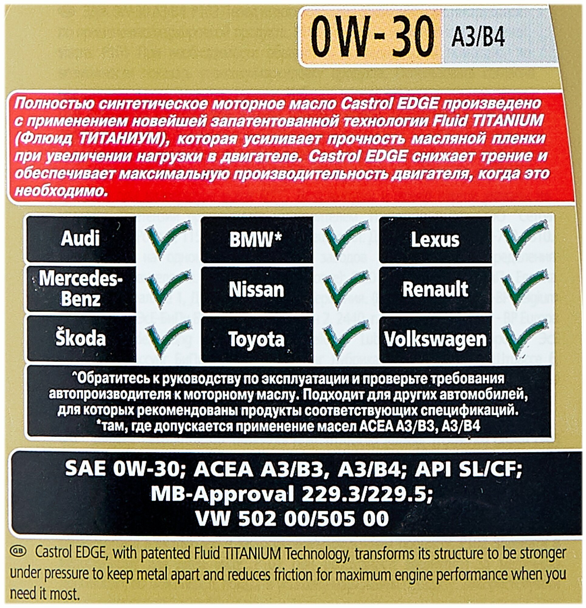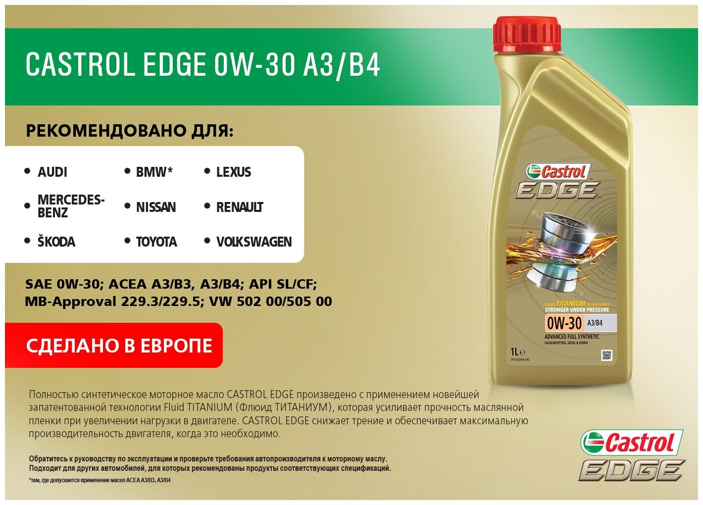 Ниже Вы можете прочитать отзывы на Полусинтетическое моторное масло Castrol Edge 0W-30 A3/B4, 1 л, 1 шт., ознакомится с подробными характеристиками, посмотреть интересные обзоры и фотографии на Полусинтетическое моторное масло Castrol Edge 0W-30 A3/B4, 1 л, 1 шт..