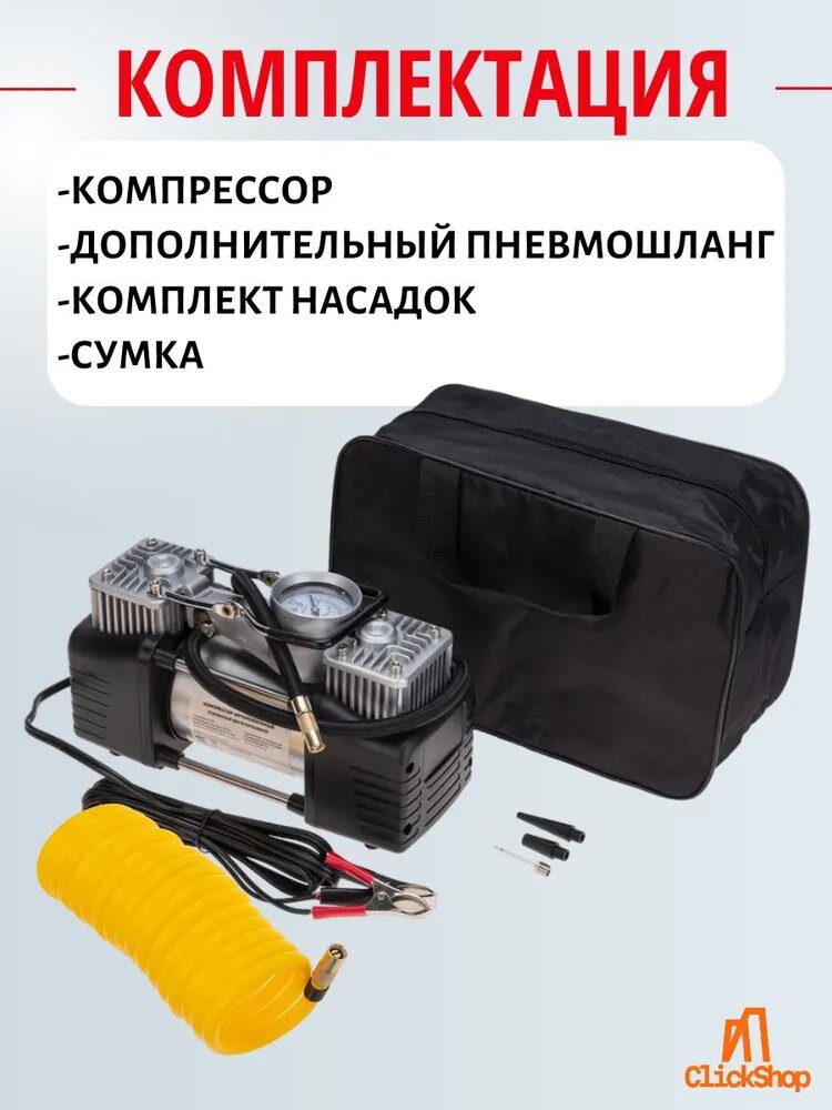 Компрессор автомобильный CityUP двухпоршневой с фонарем, 60л/мин, 300 Ватт, сумка в комплекте + переходник для АКБ