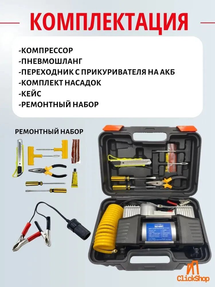 Купить Компрессор автомобильный, двухпоршневой, с кейсом и ремкомплектом, 85 л/мин