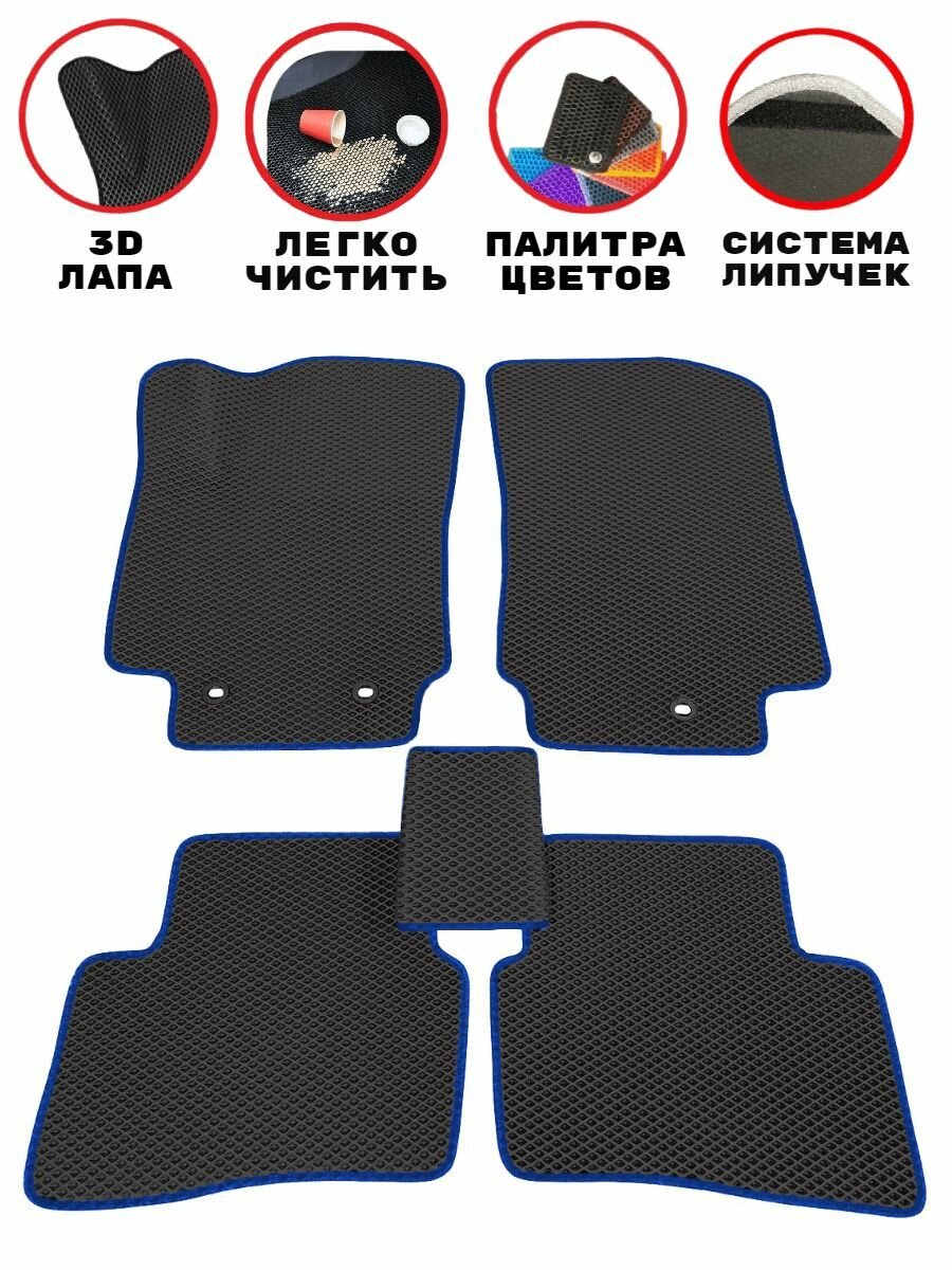 Комплект ковриков EVA/ЭВА для Changan CS95 Plus New, Чанган СиЭс 95 плюс, 2023 г, с 3Д лапой, черные соты с синим кантом