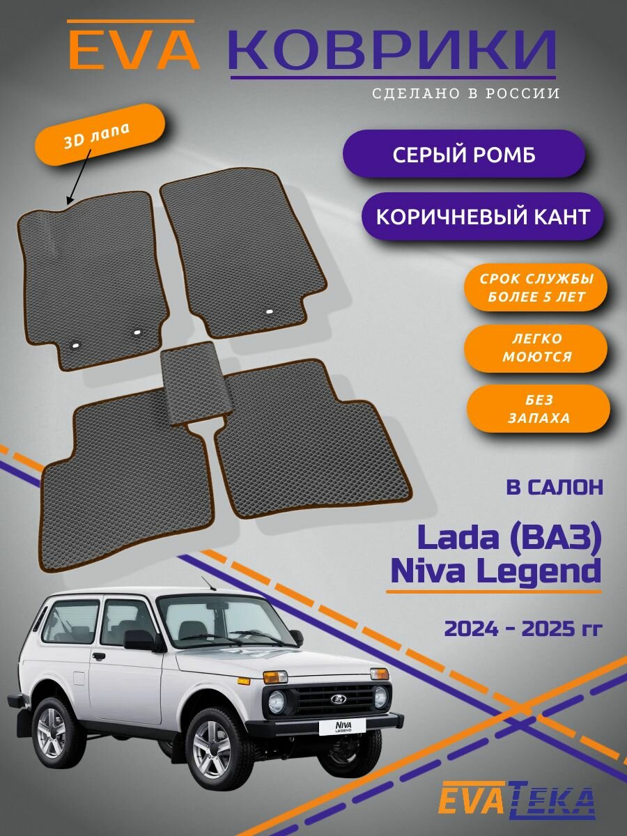 Купить EVA коврики для Niva Legend, Нива Легенд, 3-х дв, 2023-2025 г. в, с 3Д лапой, износостойкие, серый ромб с коричневым кантом