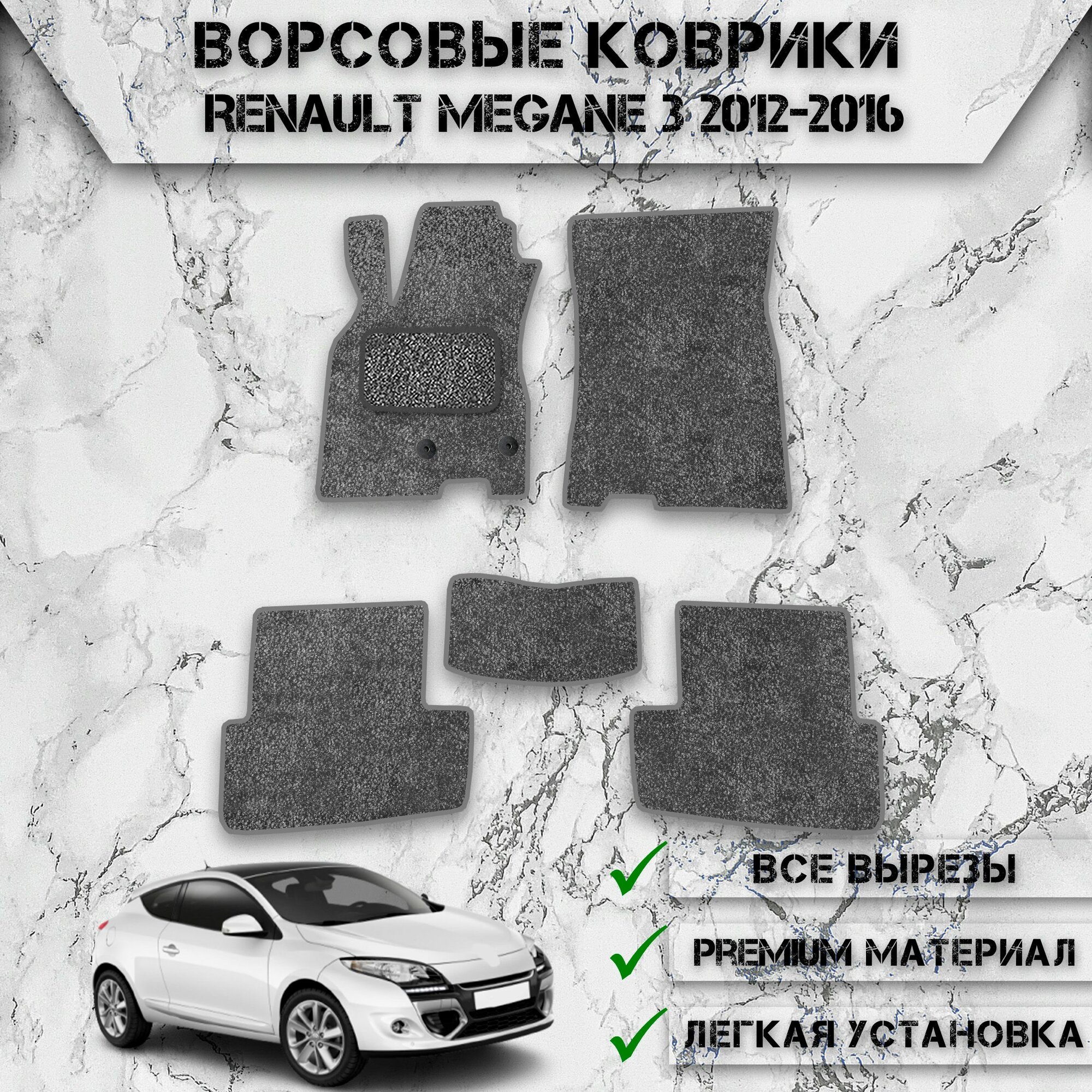 Купить Ворсовые коврики "Стандарт" для авто Ренаулт Меган / Renault Megane 3 2012-2016Г. В. Серый С Серым Кантом