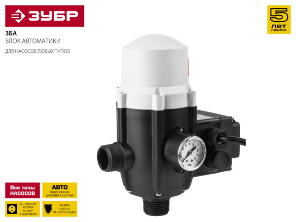 Блок автоматики Зубр ЗБА, 1", давление срабатывания 1.5 Атм,макс мощность подключаемых насосов 1.1 кВт интересное: