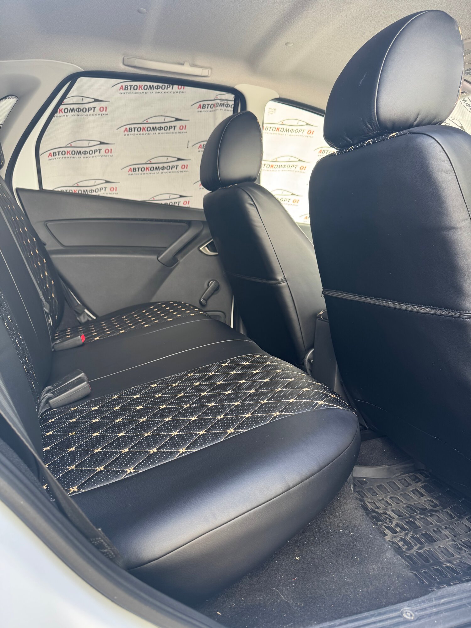 СохранитьКомплект чехлов для LADA Granta, Datsun on-Do (Задняя спинка сплошная). Экокожа, ромб, черный, бежевая строчка бабочка. интересное: