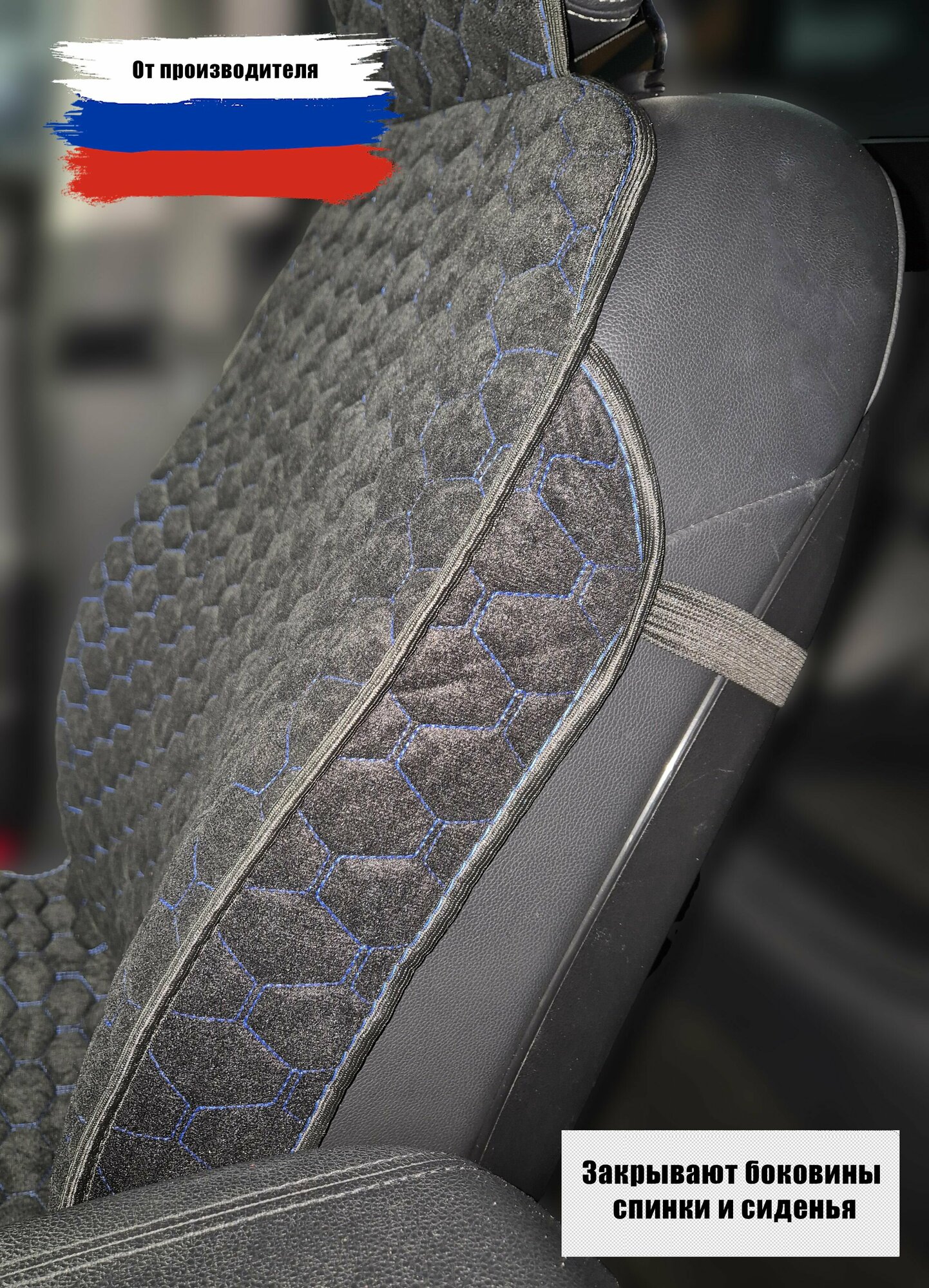 Накидки для Рено Кэнгу (2021 - 2025) фургон / Renault Kangoo на передние сиденья G-Soty, Велюр, Черный с синей строчкой. интересное: