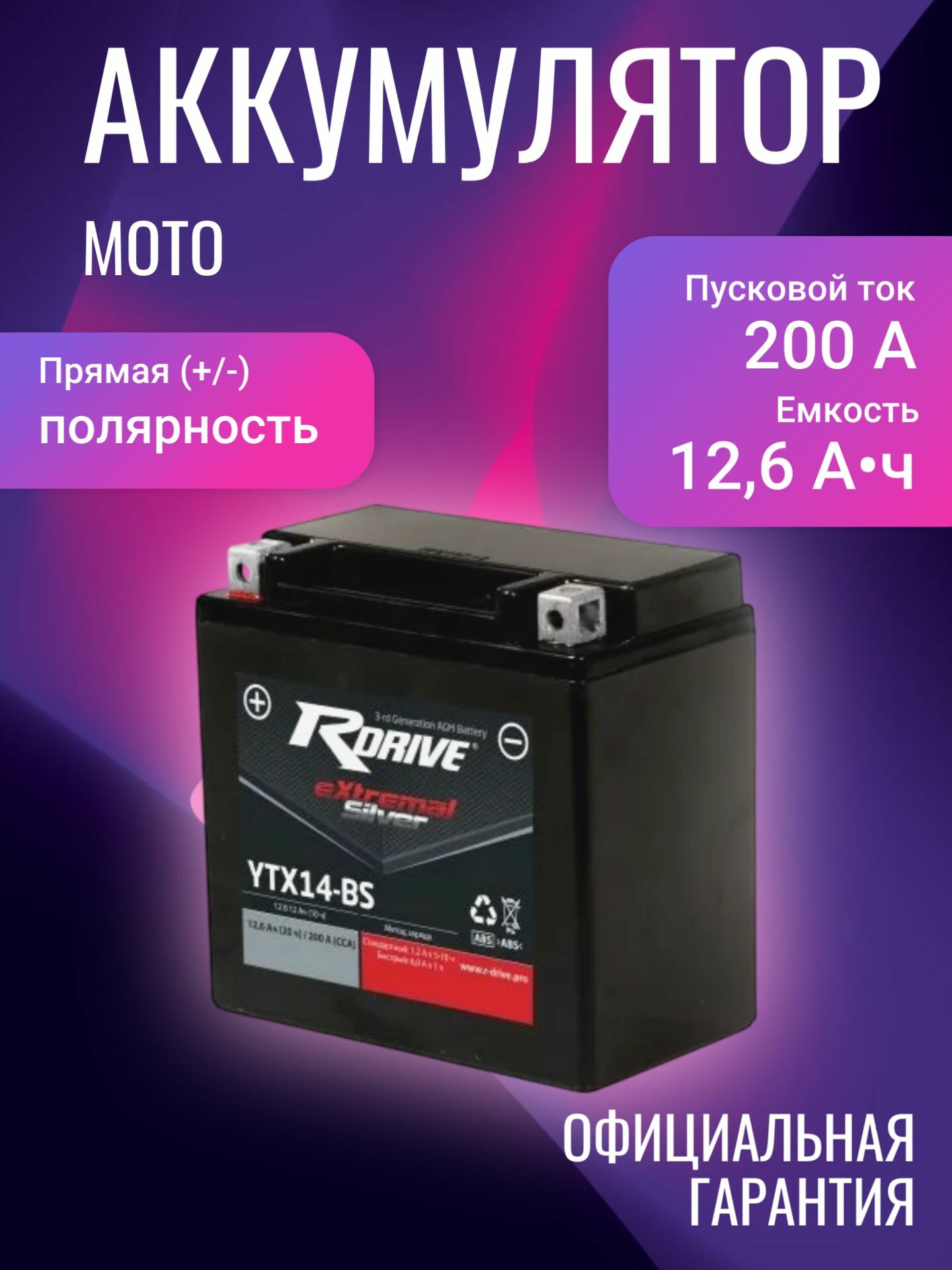 Аккумулятор мотоциклетный RDrive Silver YTX14-BS 12В 12,6Ач 200А интересное: