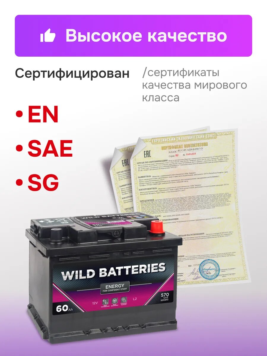 Аккумулятор автомобильный WILD Batteries 60 Ач 520 A обратная полярность интересное: